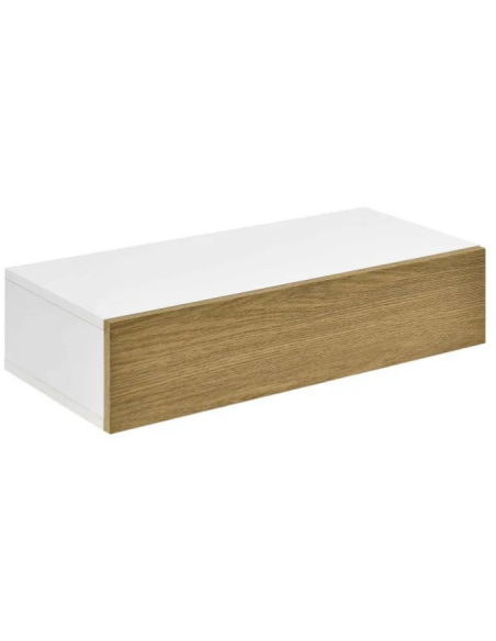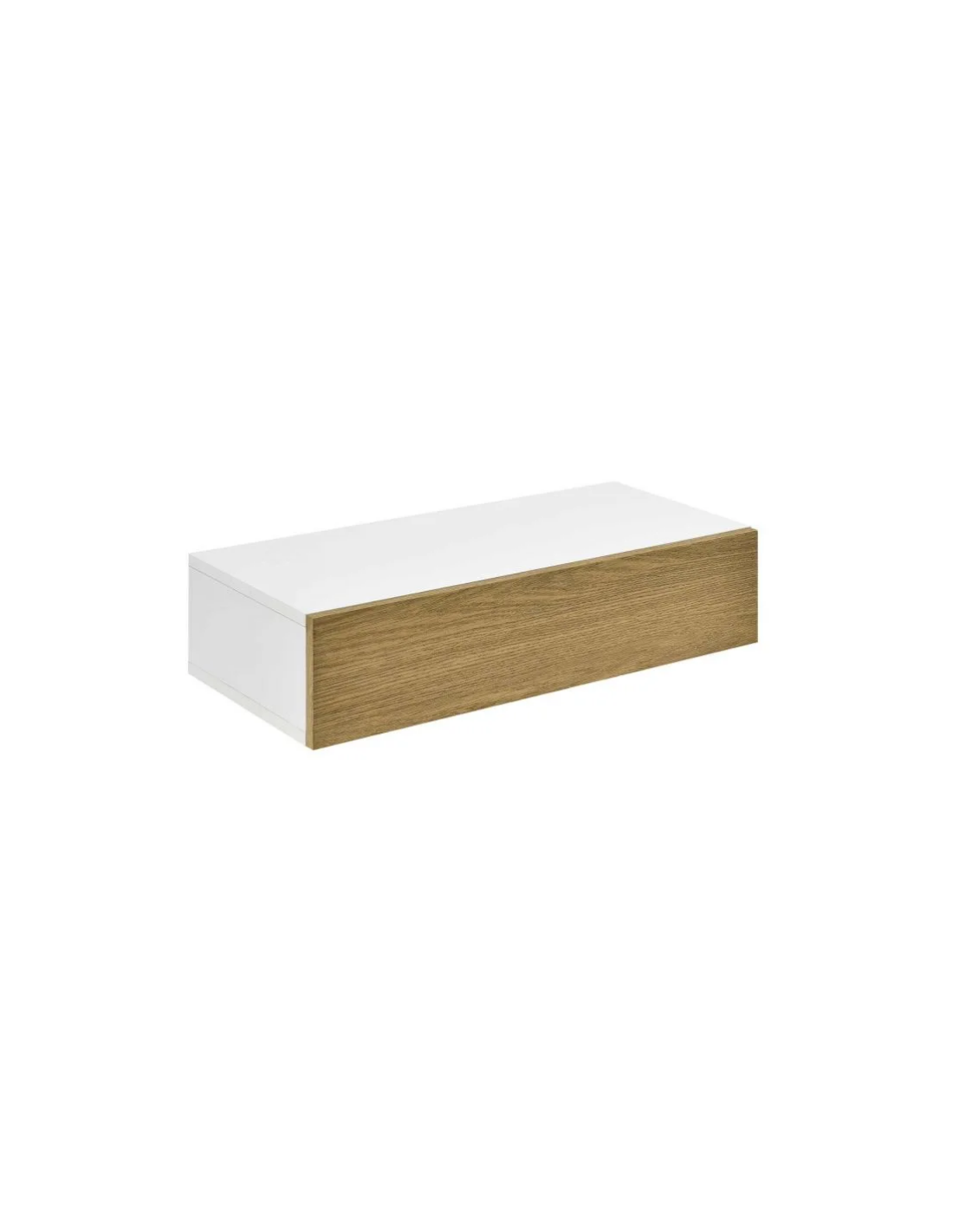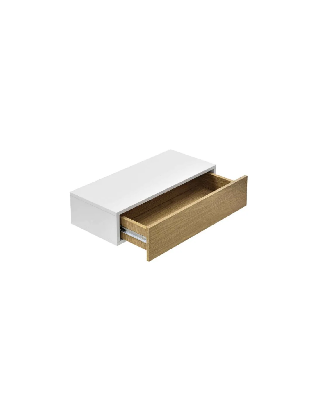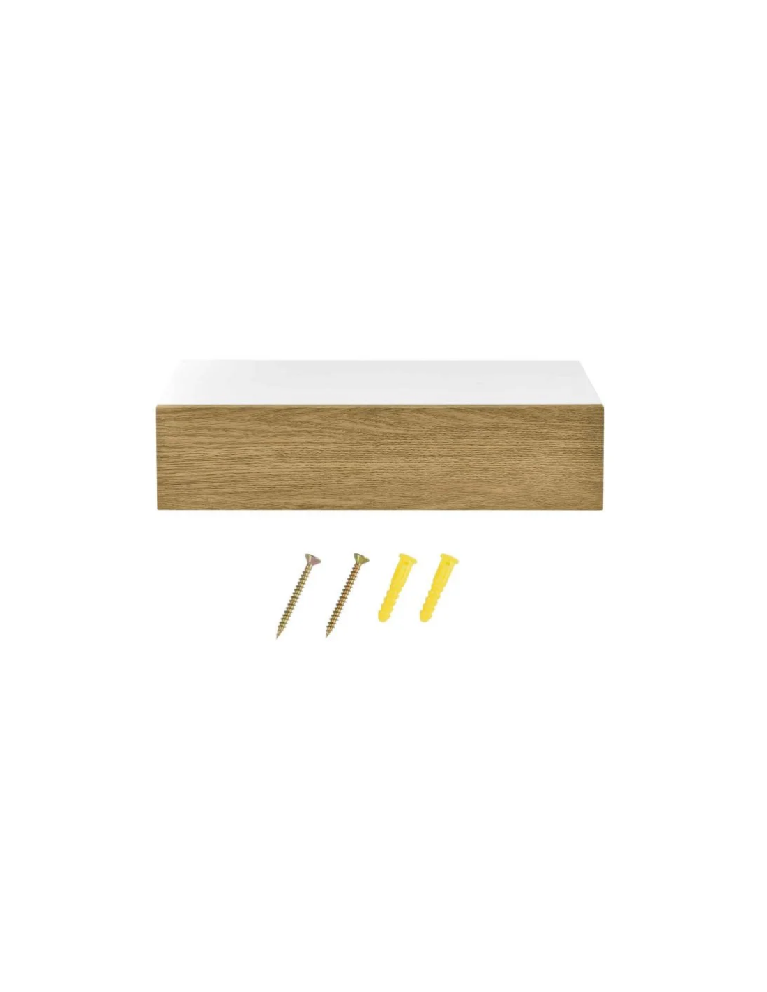 Sæt med 2 væghængte sengeborde, udført i et design af hvid og naturfarvet møbelplade. Sengebordet måler 12 cm i højden og 50 x 24 cm i bredde og dybde.