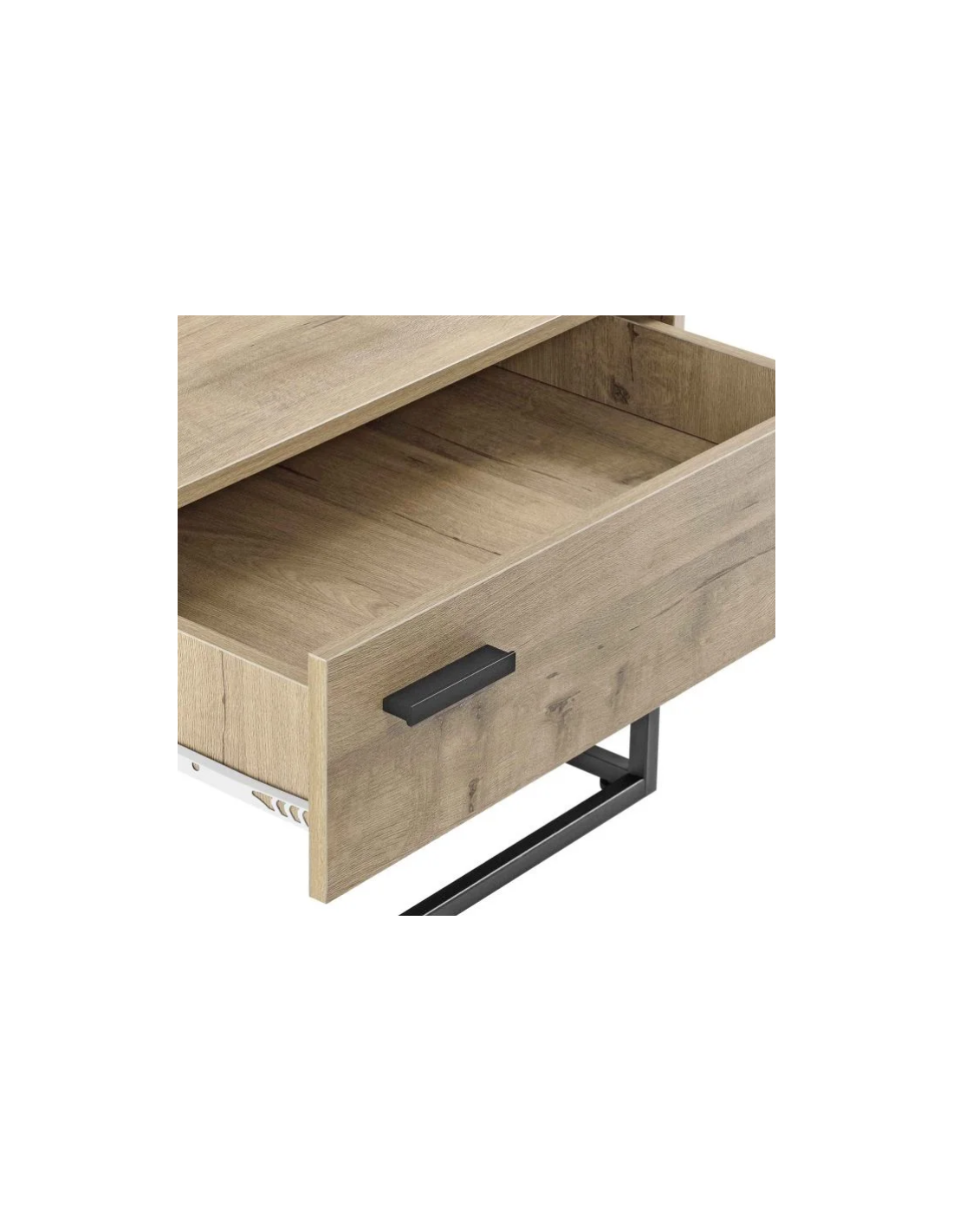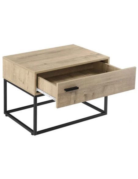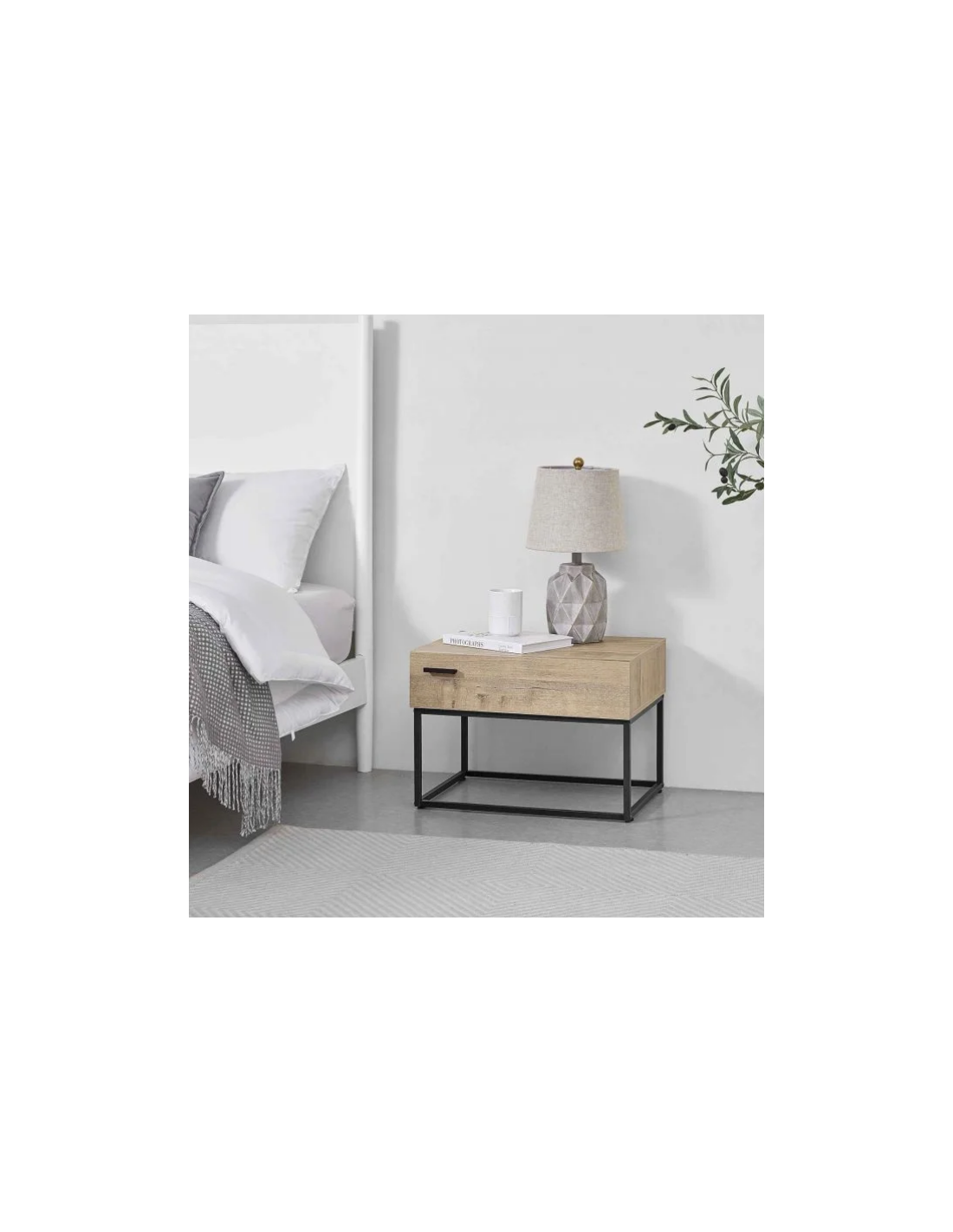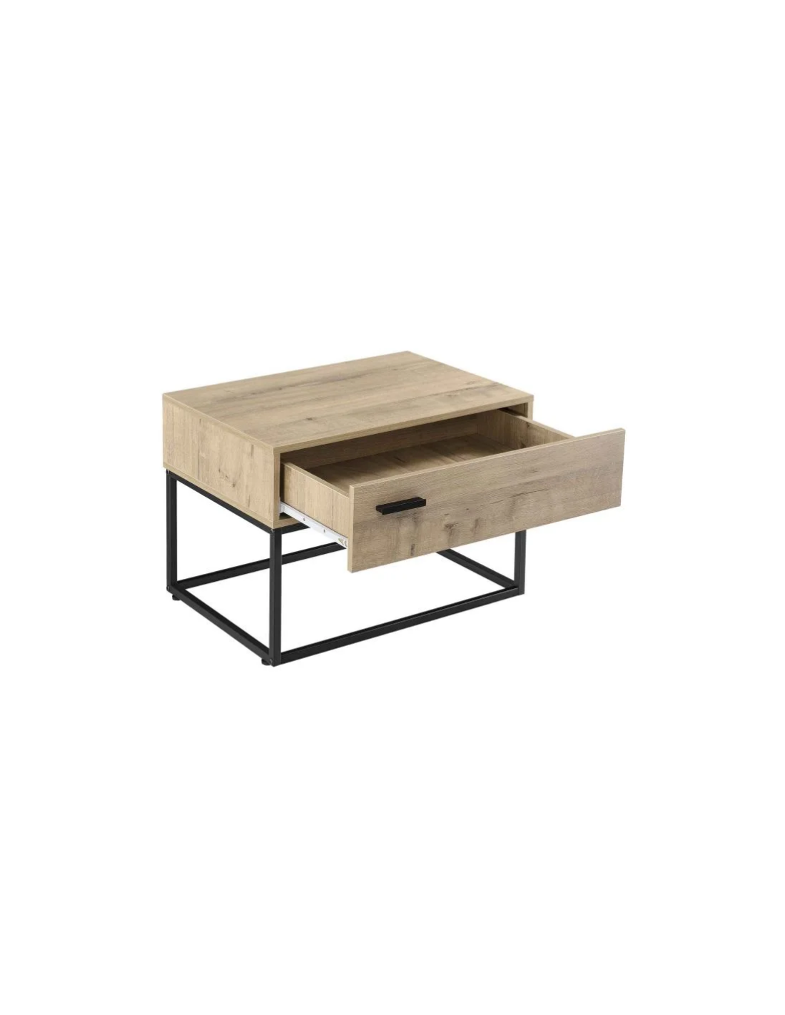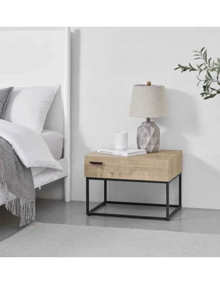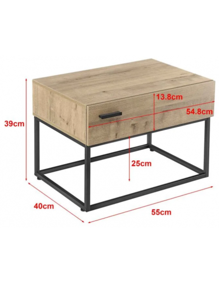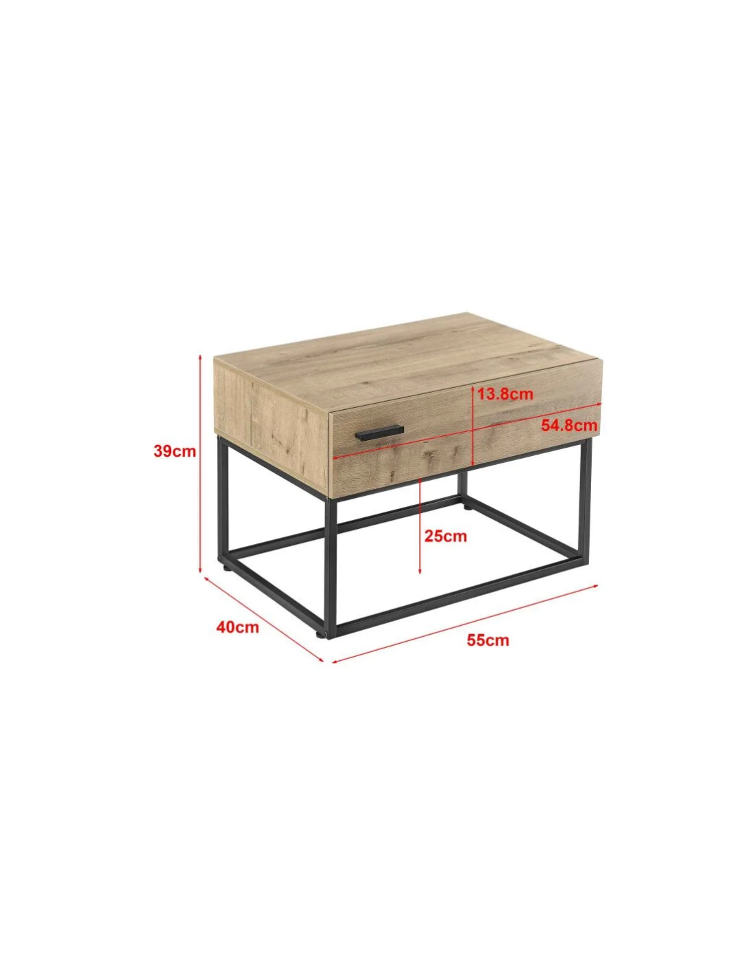 Sengebord udført i et design af metal og møbelplade. Sengebordet måler 39 cm i højden og 55 x 40 cm i bredde og dybde.