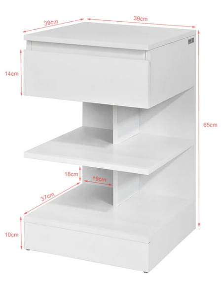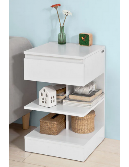 Sengebord udført i et design af møbelplade. Sengebordet måler 65 cm i højden og 39 x 39 cm i bredde og dybde.
