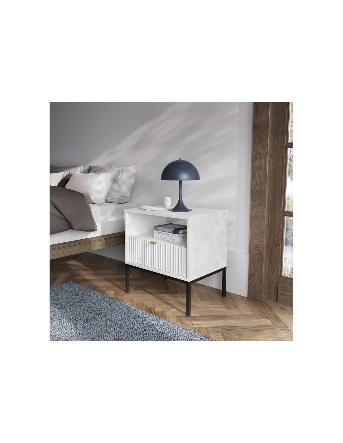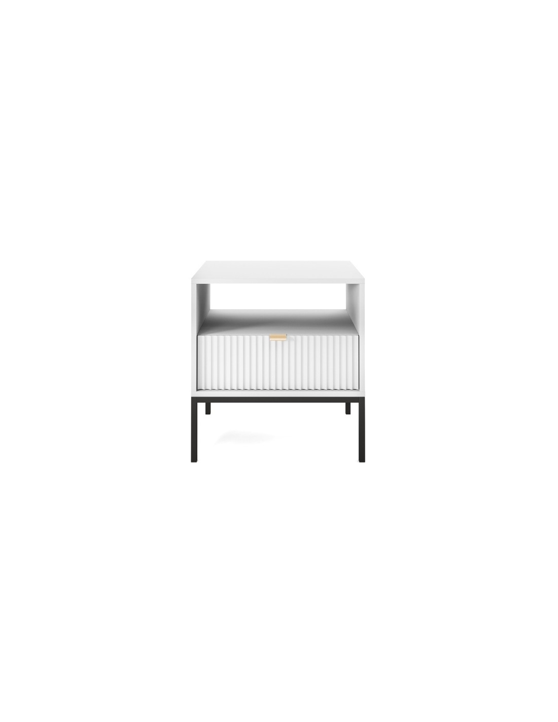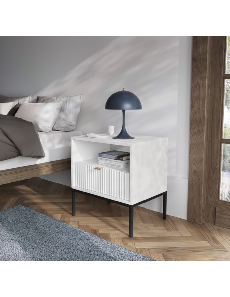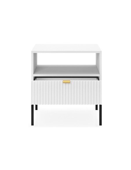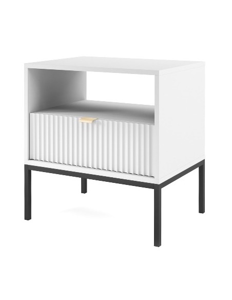 Nova sengebord udført i et design af sortlakeret metal og hvid møbelplade med detaljer i guldfarvet metal. Sengebordet måler 56 cm i højden og 54 x 39 cm i bredde og dybde. Sengebordet indeholder 1 skuffe og 1 åbent hylderum.