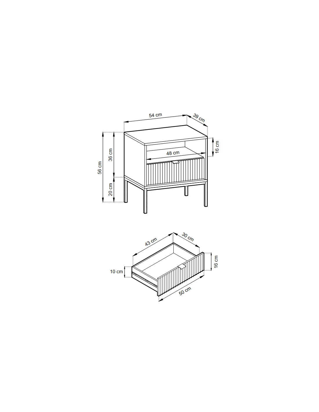 • 1 skuffe og 1 åbent hylderum