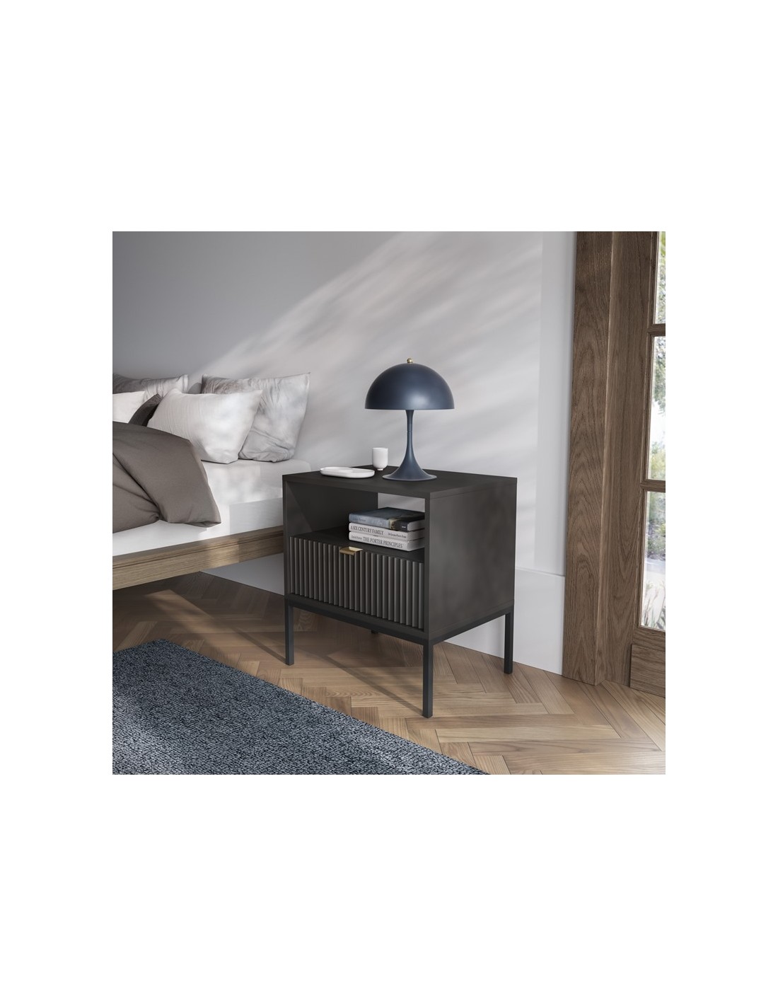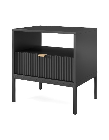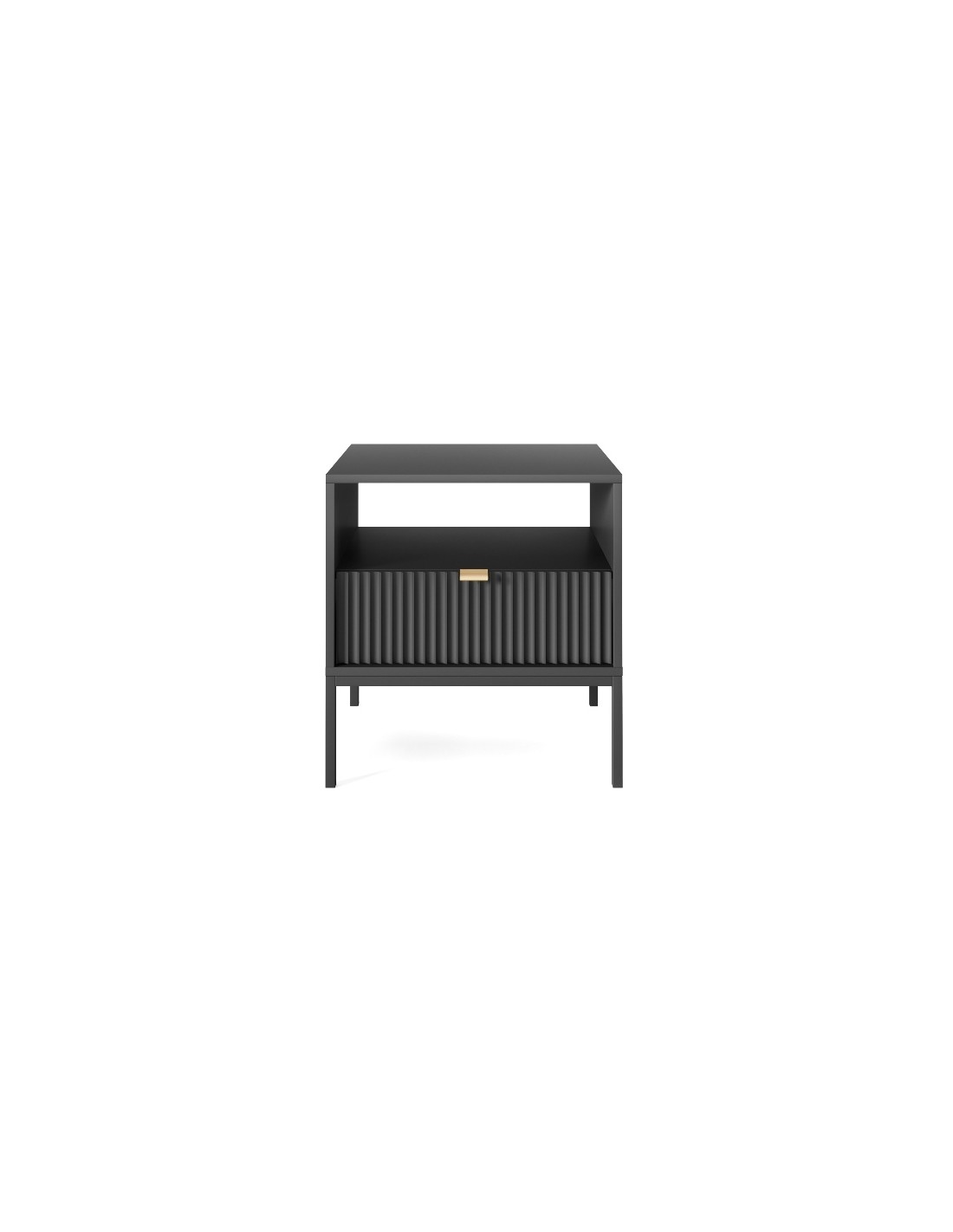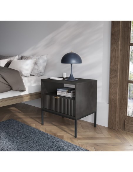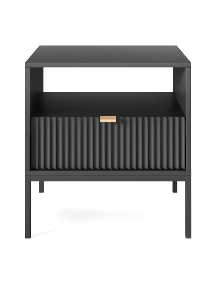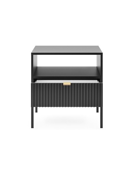Nova sengebord udført i et design af sortlakeret metal og møbelplade med detaljer i guldfarvet metal. Sengebordet måler 56 cm i højden og 54 x 39 cm i bredde og dybde. Sengebordet indeholder 1 skuffe og 1 åbent hylderum.