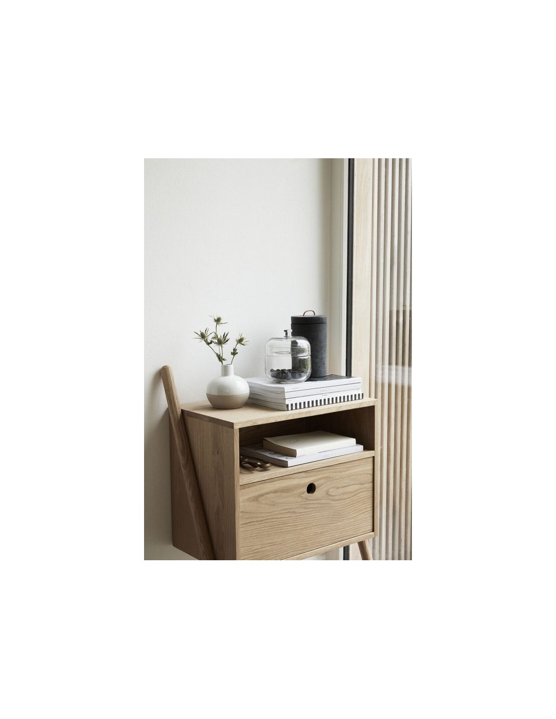 Hübsch Lean sengebord udført i et design af egetræ og egetræsfinér. Sengebordet måler 83 cm i højden og 56 x 30 cm i bredde og dybde. Sengebordet monteres til væggen, og kommer med 1 åbent hylderum samt 1 skuffe.