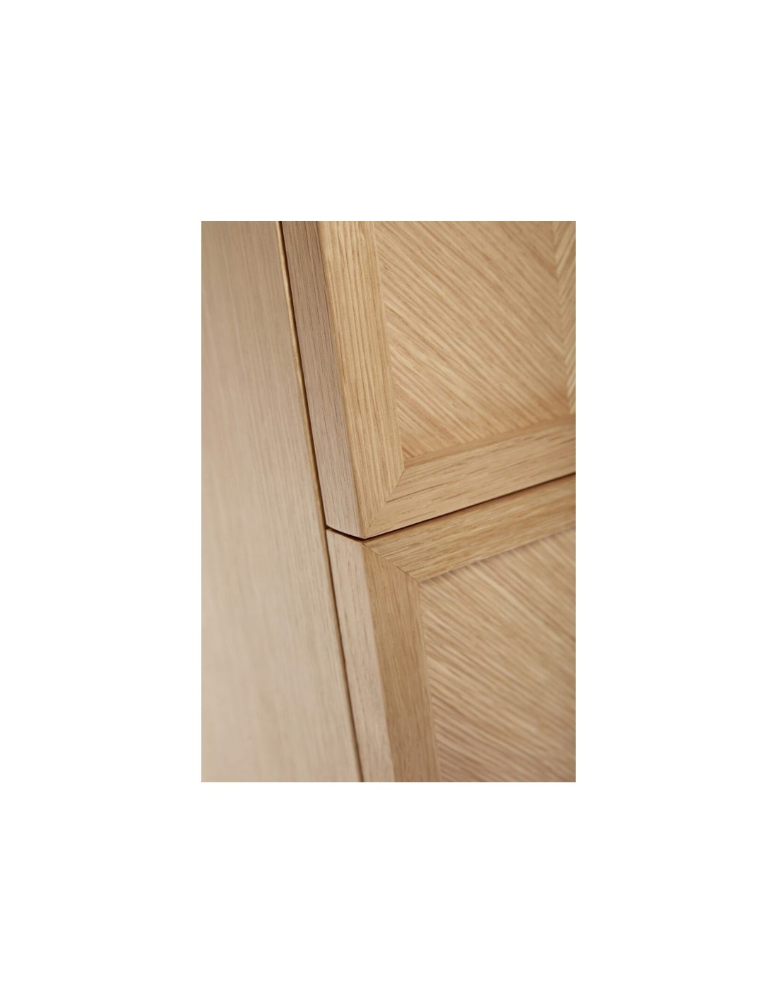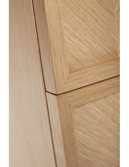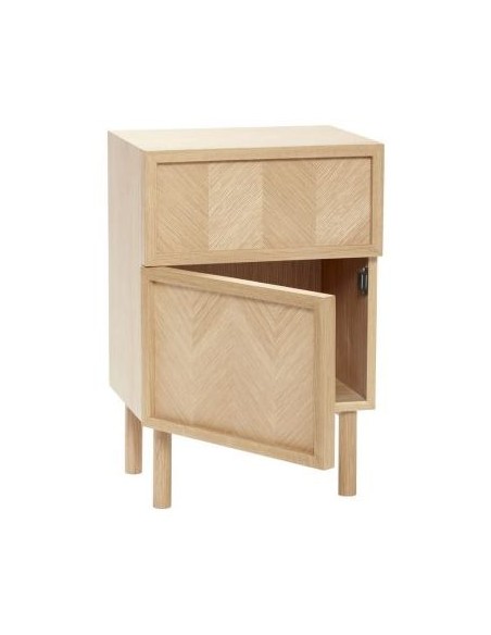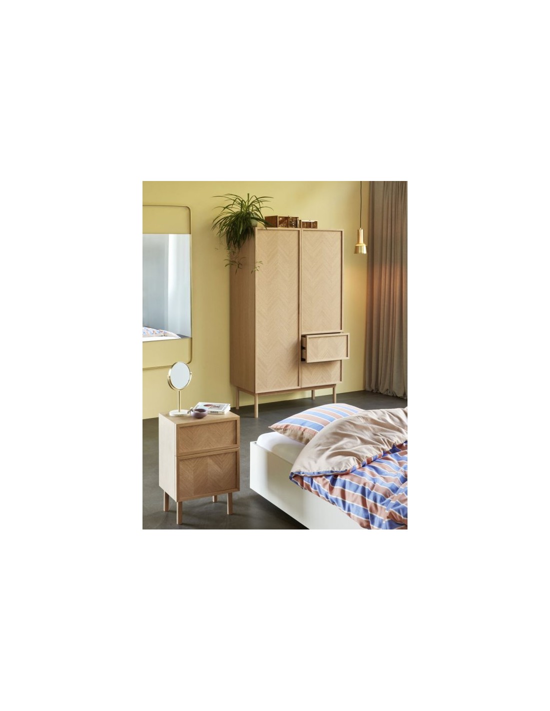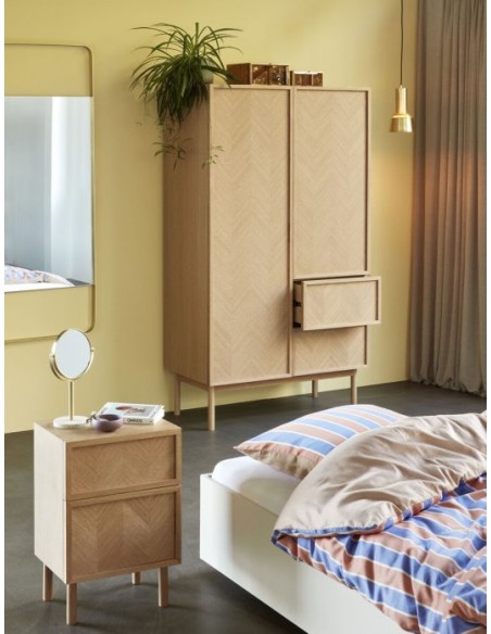 Hübsch Herringbone sengebord udført i et design af egetræ og egetræsfinér. Sengebordet måler 60 cm i højden og 40 x 30 cm i bredde og dybde. Sengebordet kommer med 1 skab samt 1 skuffe.