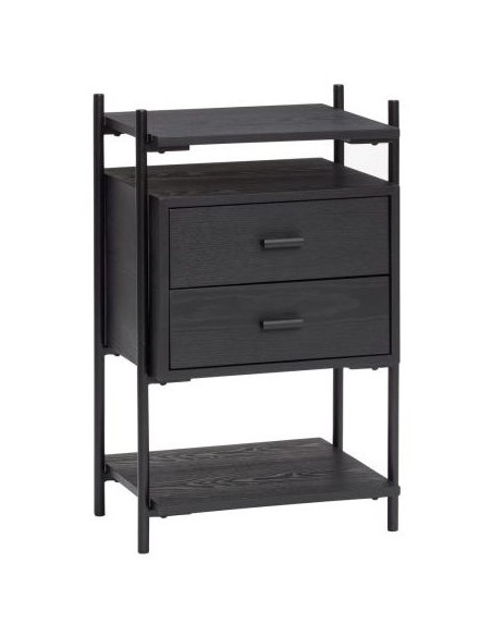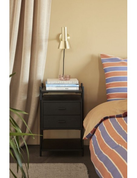 Hübsch Norm sengebord udført i et design af asktræ og metal. Sengebordet måler 61 cm i højden og 39 x 33 cm i bredde og dybde. Sengebordet kommer med 2 åbne hylderum samt 2 skuffer.