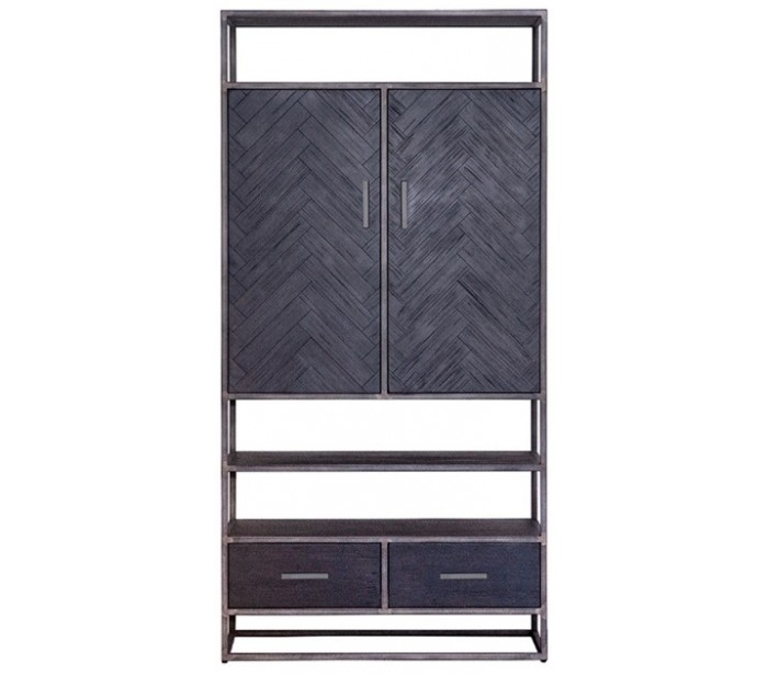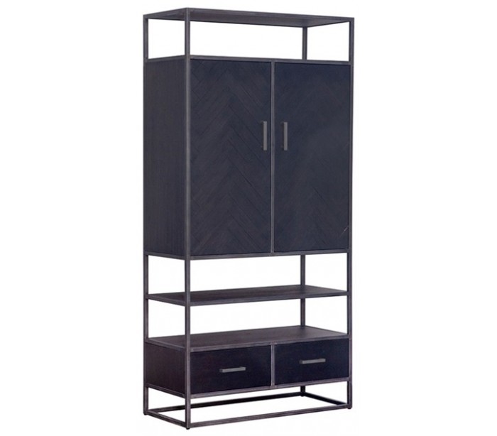 Kabinet i et industrielt design, fremstillet med bordplade i rustikt sortlakeret akacietræ og stel i jerngrå metal. Kabinettet måler 200 cm i højden og 100 x 42 cm i bredde og dybde og indeholder 2 skuffer samt 2 skabe, hver med 3 hylderum.