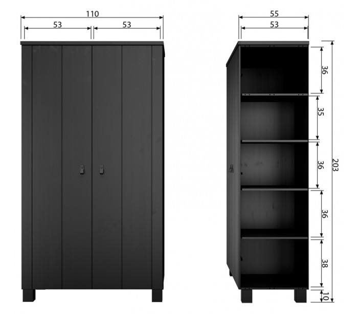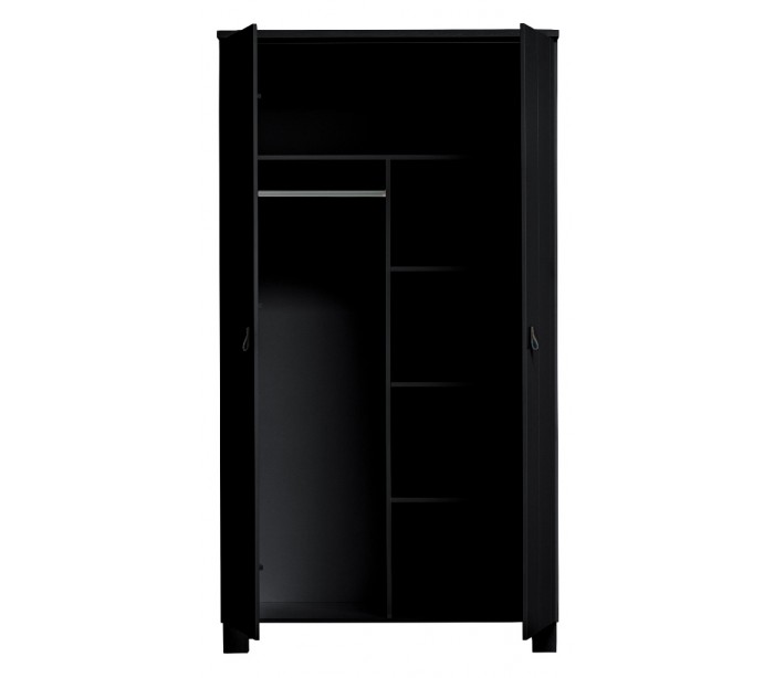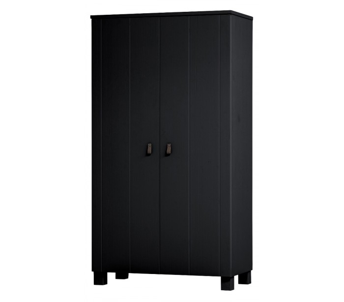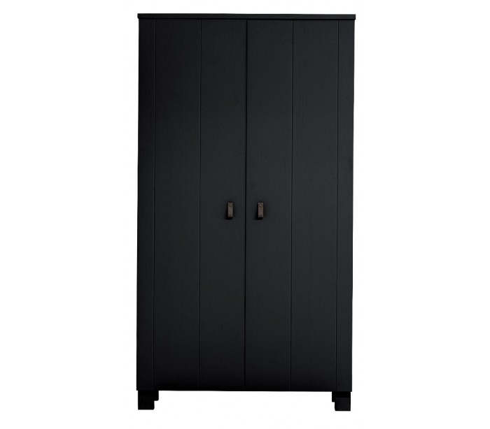 Garderobeskab i et moderne design, fremstillet i sortlakeret fyrretræ. Skabet indeholder 5 hylderum samt 1 bøjlestang og måler 202 cm i højden og 111 x 55 cm i bredde og dybde.