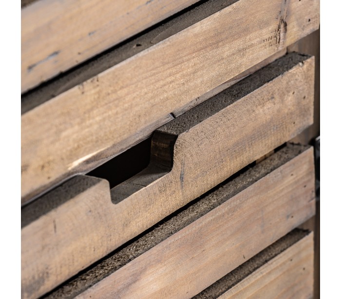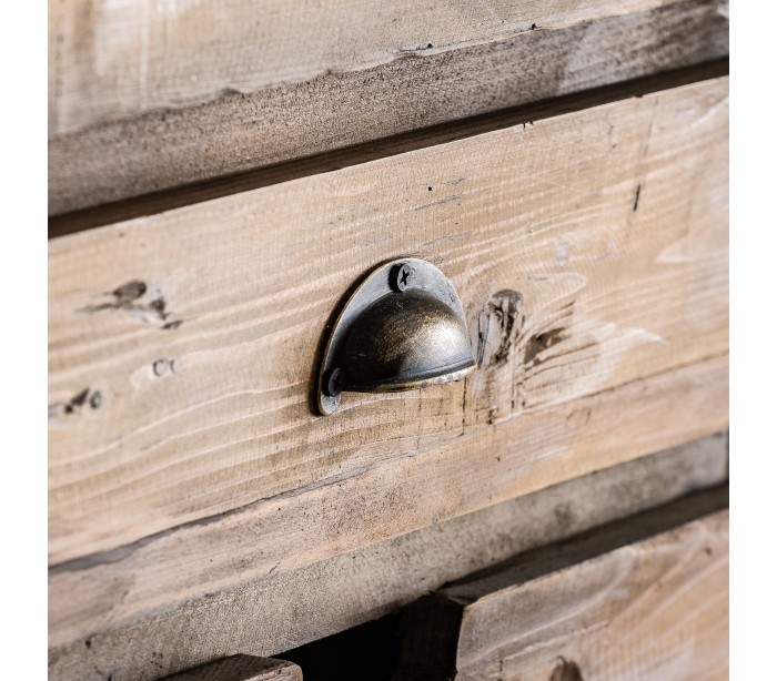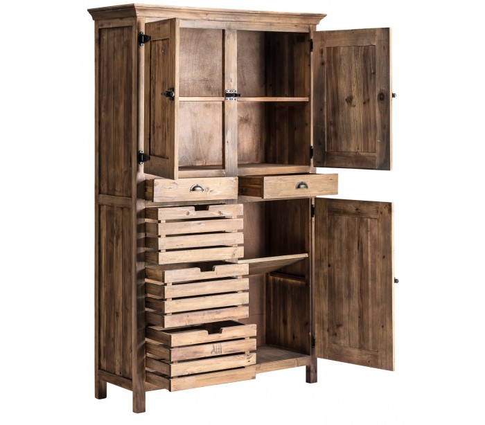 Skab i et rustikt design, fremstillet genanvendt fyrretræ. Skabet måler 200 cm i højden og 124 cm i bredden og kommer med 3 skabe og 5 skuffer. Bemærk venligst, at der jf. det rustikke design, kan være små ujævnheder.