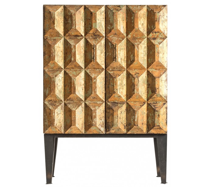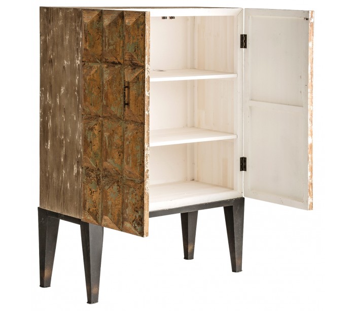 Skab i et rustikt design, fremstillet fyrretræ i antik guld og med stel i antik sortlakeret jern. Skabet måler 140 cm i højden og 96 cm i bredden og indeholder 3 hylderum. Bemærk venligst, at der jf. det rustikke design, kan være små ujævnheder.