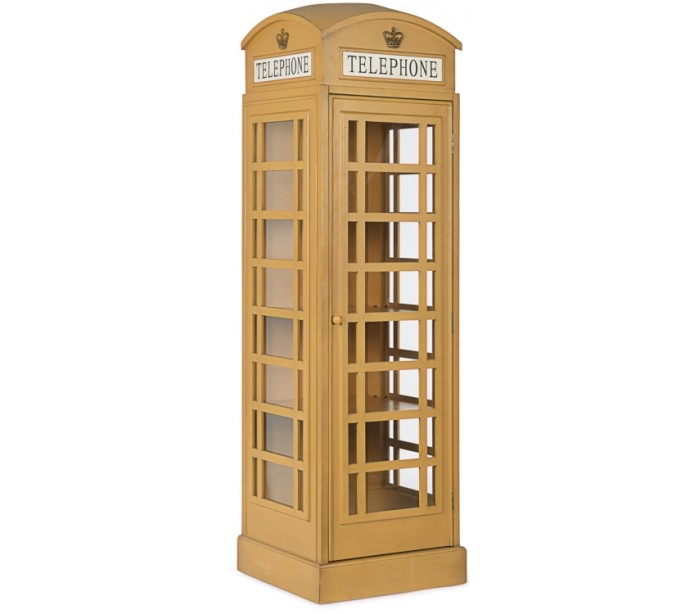 Telefonboks skab i et rustikt design, fremstillet i antik gul lakeret fyrretræ og mdf. Skabet måler 180 cm i højden og 53 x 51,5 cm i bredde og dybde. I skabet forefindes 3 hylder = 4 hylderum.