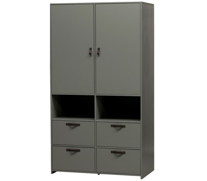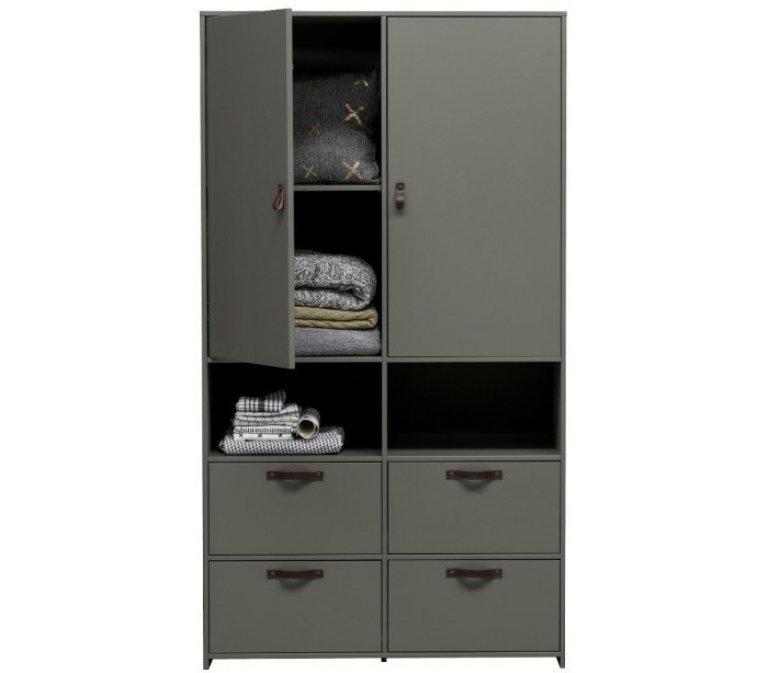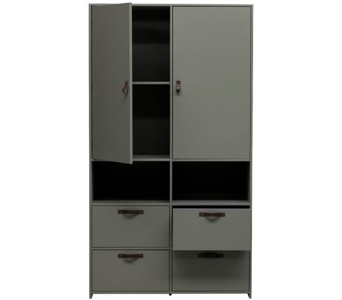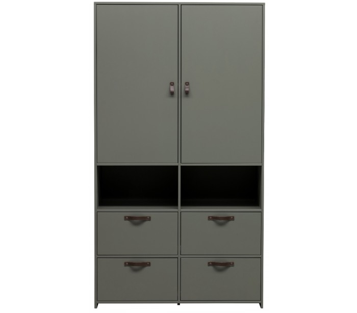 Skab udført i et moderne design, fremstillet i grønmalet fyrretræ og med hængsler i læder. Skabet indeholder 2 skabe med i alt 4 hylderum, samt 2 hylderum og 4 skuffer. Skabet måler 185 cm i højden og 103 cm i bredde og 40 cm i dybden.