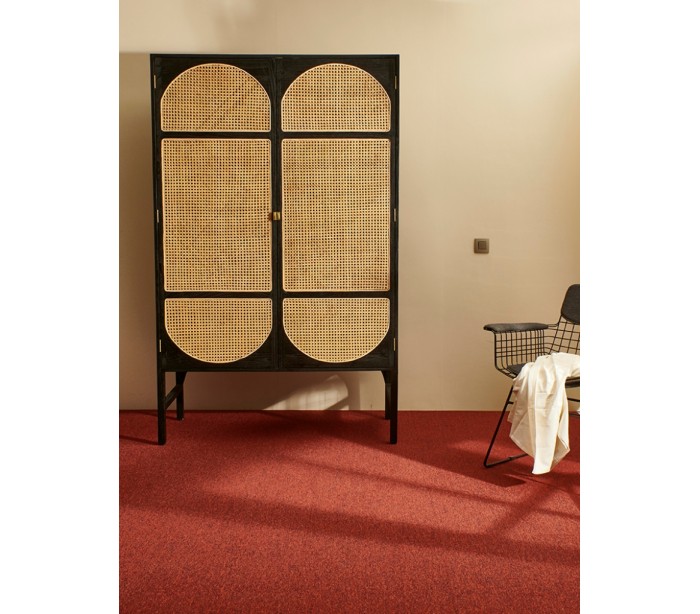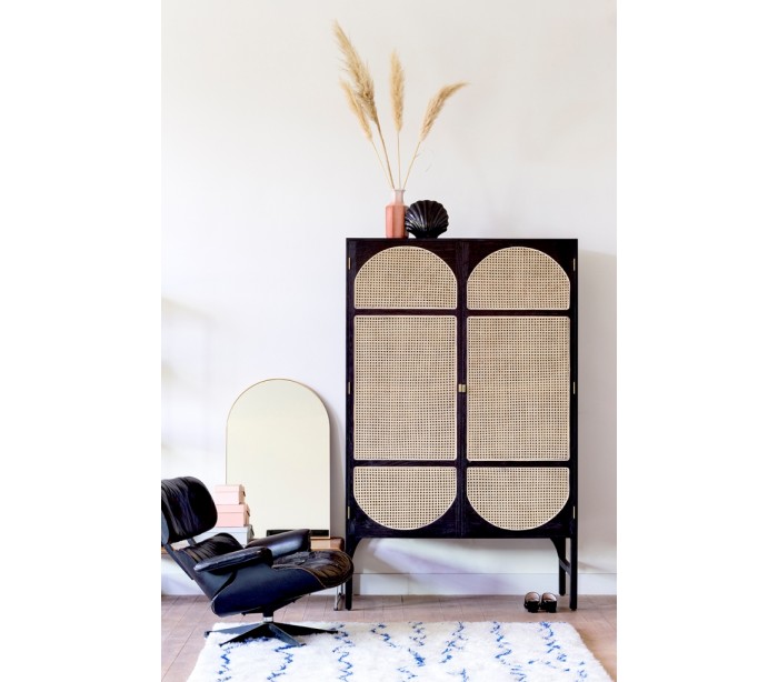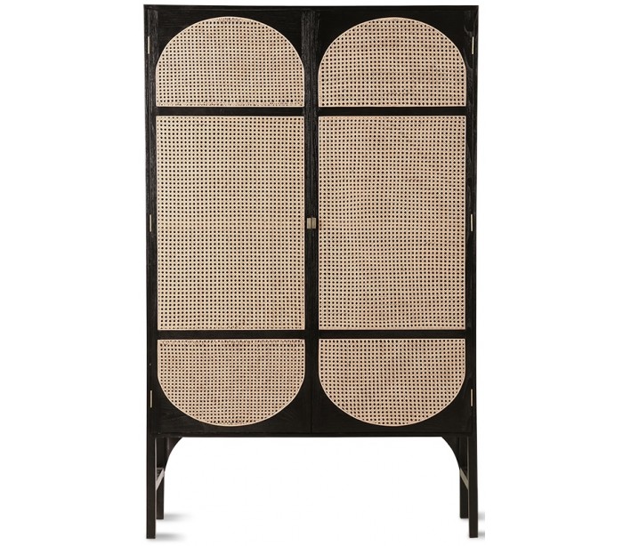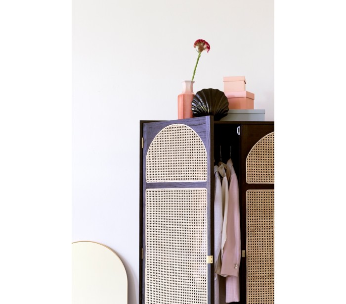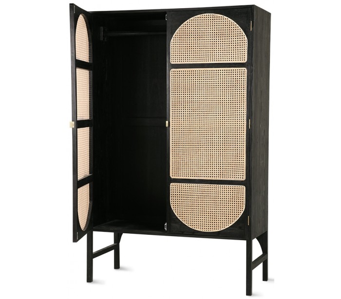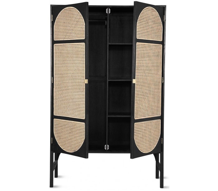 Klædeskab udført i et moderne design, fremstillet i sortlakeret Sungkaitræ og naturfarvet flet. Skabet indeholder 4 hylderum samt 1 bøjlestang. Skabet måler 200 cm i højden og 125 cm i bredden. Håndtagene er fremstillet i messing.
