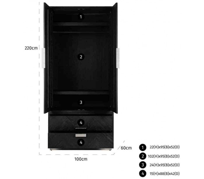 Klædeskab i et design fra hollandske Richmond Interiors. Skabet er fremstillet i egetræ og stål og måler 100 x 60 cm i bredde og dybde og 220 cm i højden. Skabet indeholder 2 skuffer forneden, og 1 dobbeltskab øverst, med 2 hylderum og 1 rum med bøjlestang.