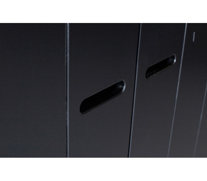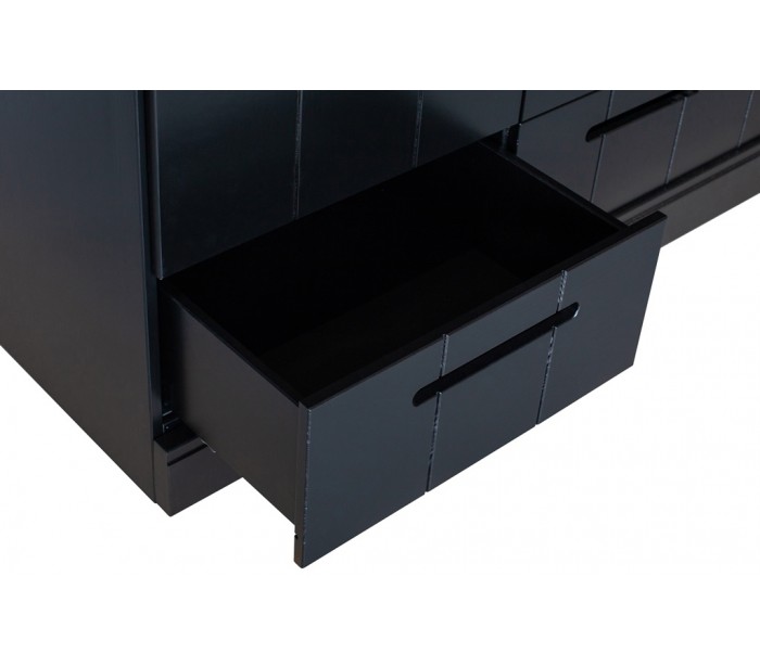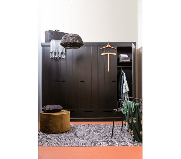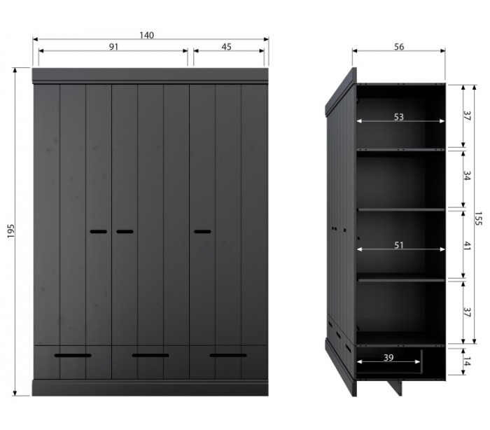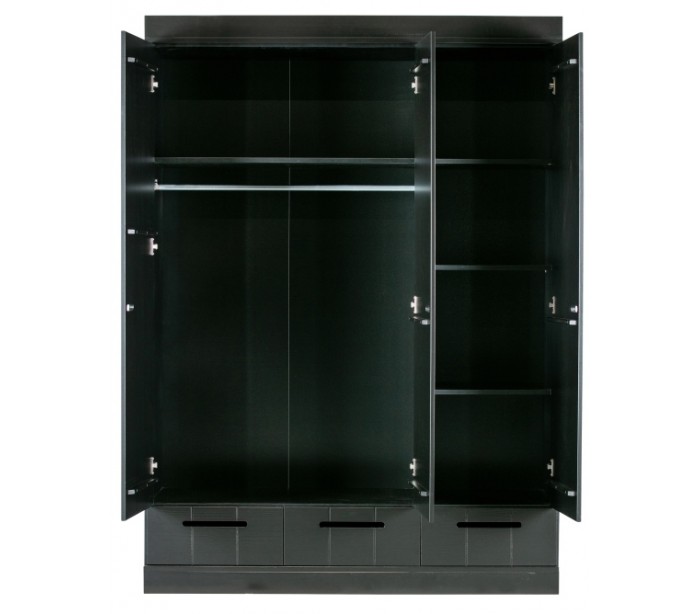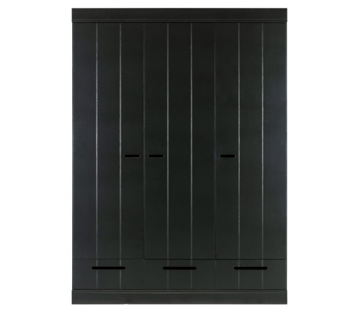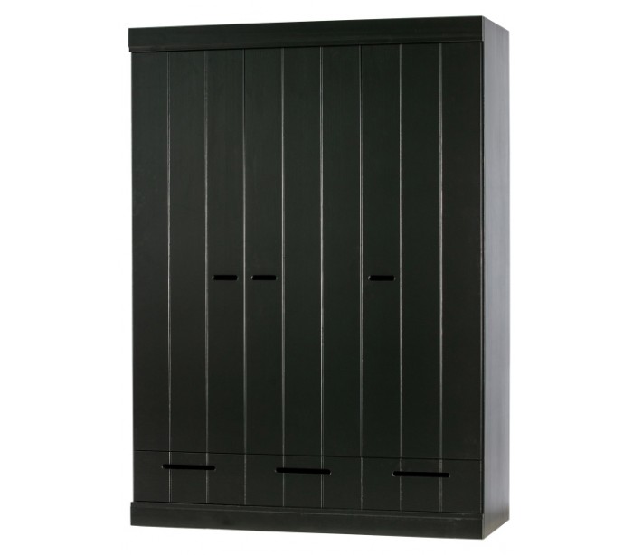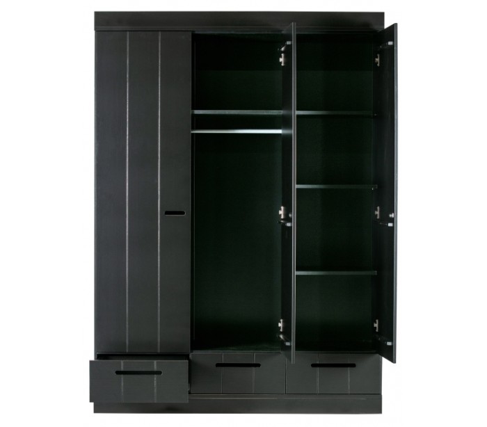 Klædeskab i et moderne design, fremstillet i sortlakeret fyrretræ. Skabet indeholder 3 skuffer, 5 hylderum og 1 bøjlestang. Skabet måler 195 cm i højden og 140 x 53 cm i bredde og dybde.