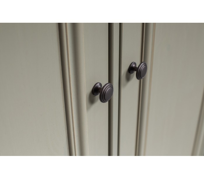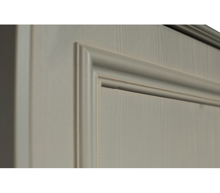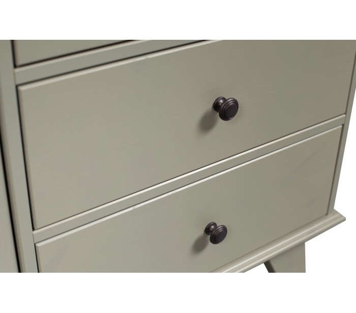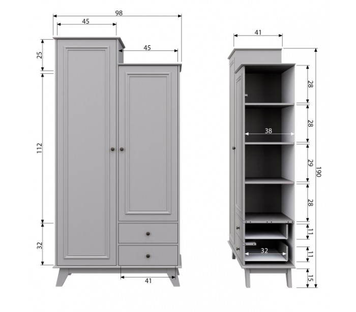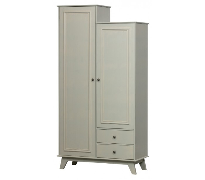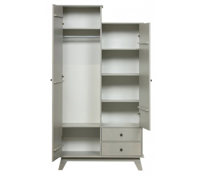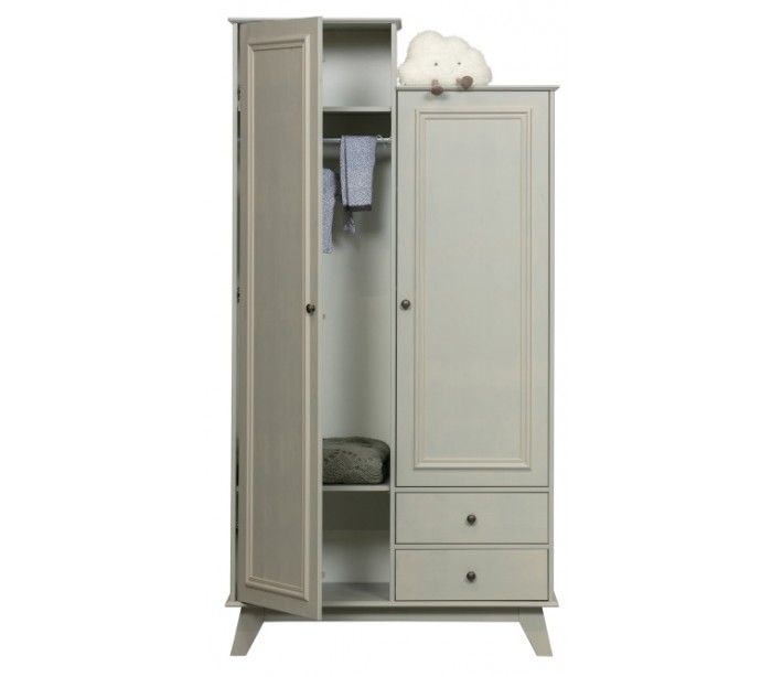 Klædeskab i et design udført i vintage lergrå lakeret fyrretræ. Skabet indeholder 2 skuffer, 6 hylderum og 1 bøjlestang og måler 190 cm i højden og 98 x 41 cm i bredde og dybde.