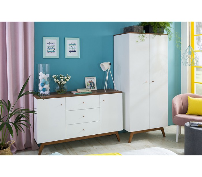 Heda klædeskab i fyrretræ, mdf og finér H194,5 cm - Hvid/Brun/Hvid højglans