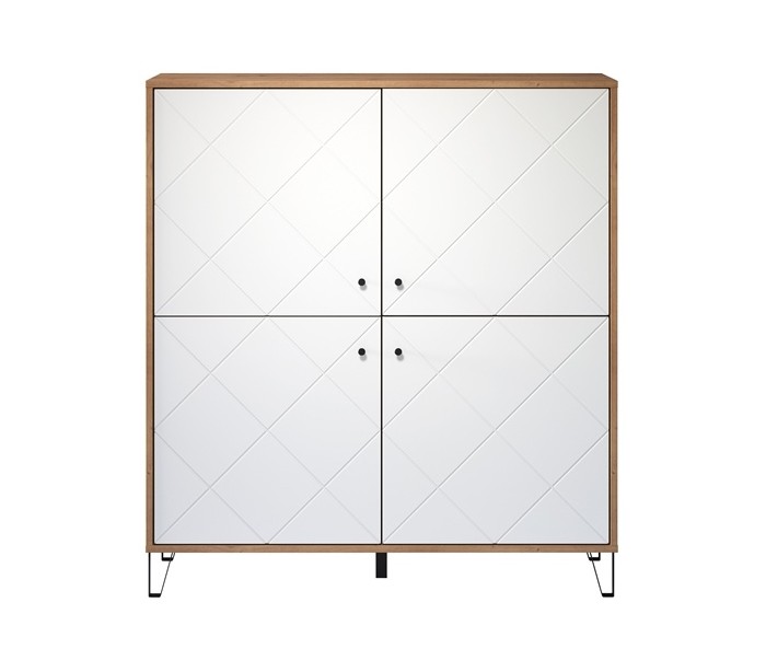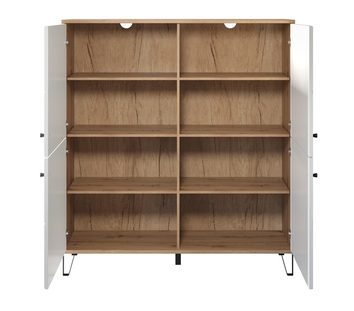 Skab med 8 hylderum, udført i et design af sortlakeret metal og hvid og vild egetræsfarvet møbelplade. Skabet måler 136 cm i højden og 123 x 40 cm i bredde og dybde.