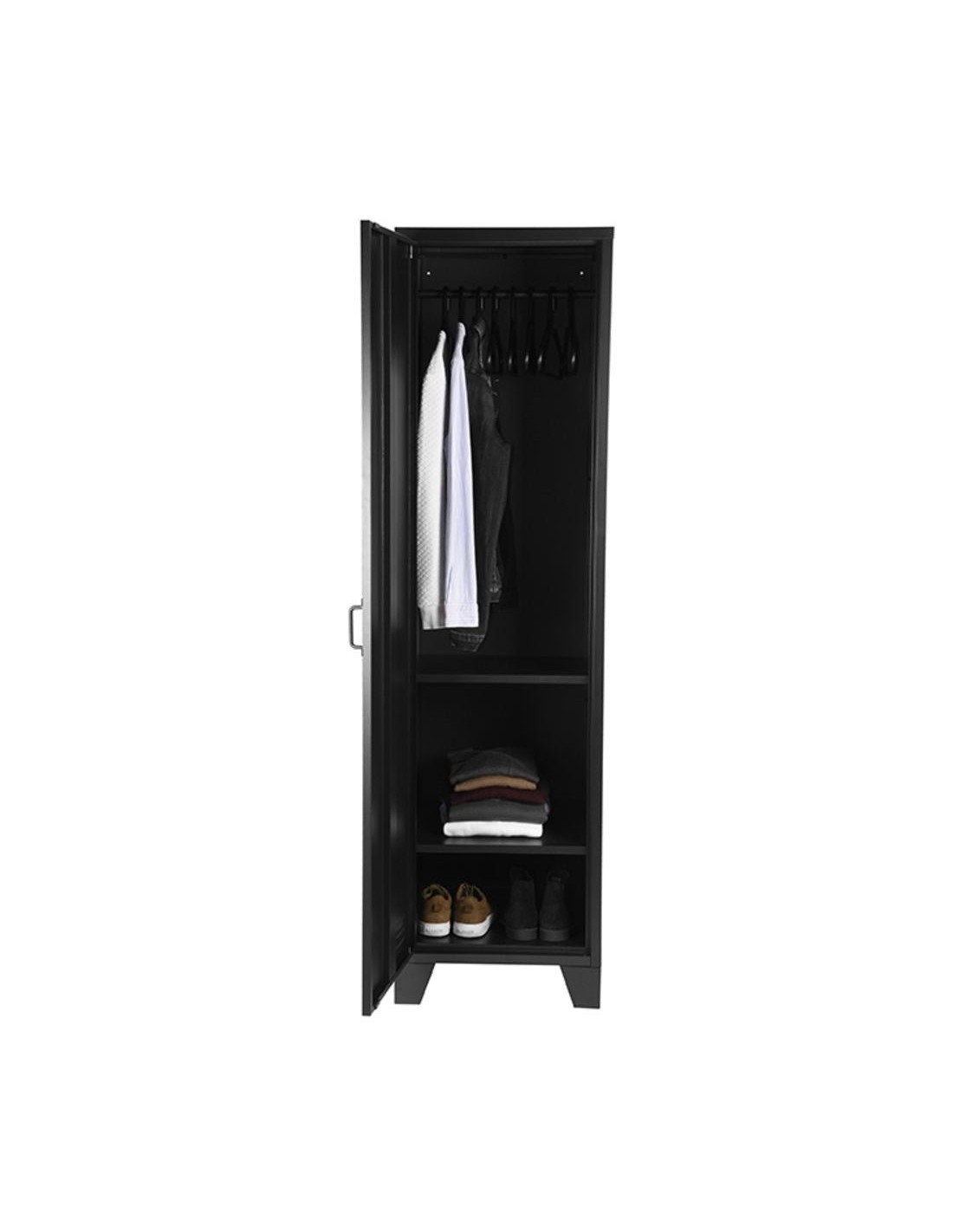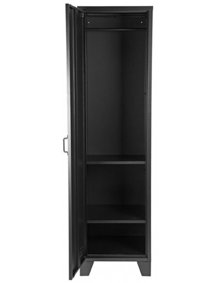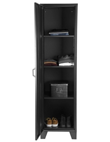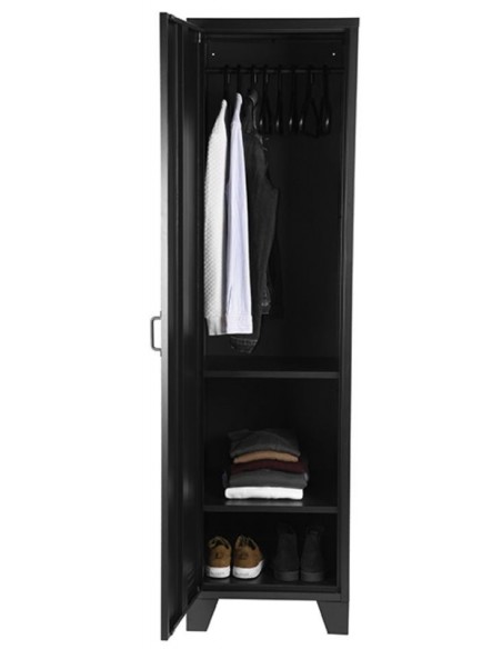 Skab udført i et industrielt design, fremstillet i industrielt sortlakeret metal. I skabet forefindes 3 hylder samt 1 bøjlestang, således du selv kan indrette skabet efter behov. Skabet måler 185 cm i højden og 50 x 50 cm i bredde og dybde.