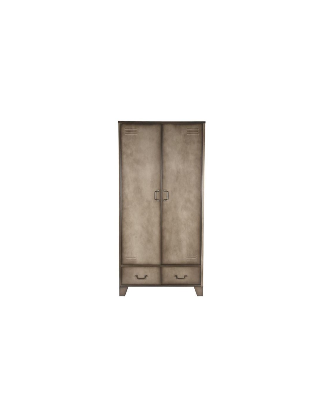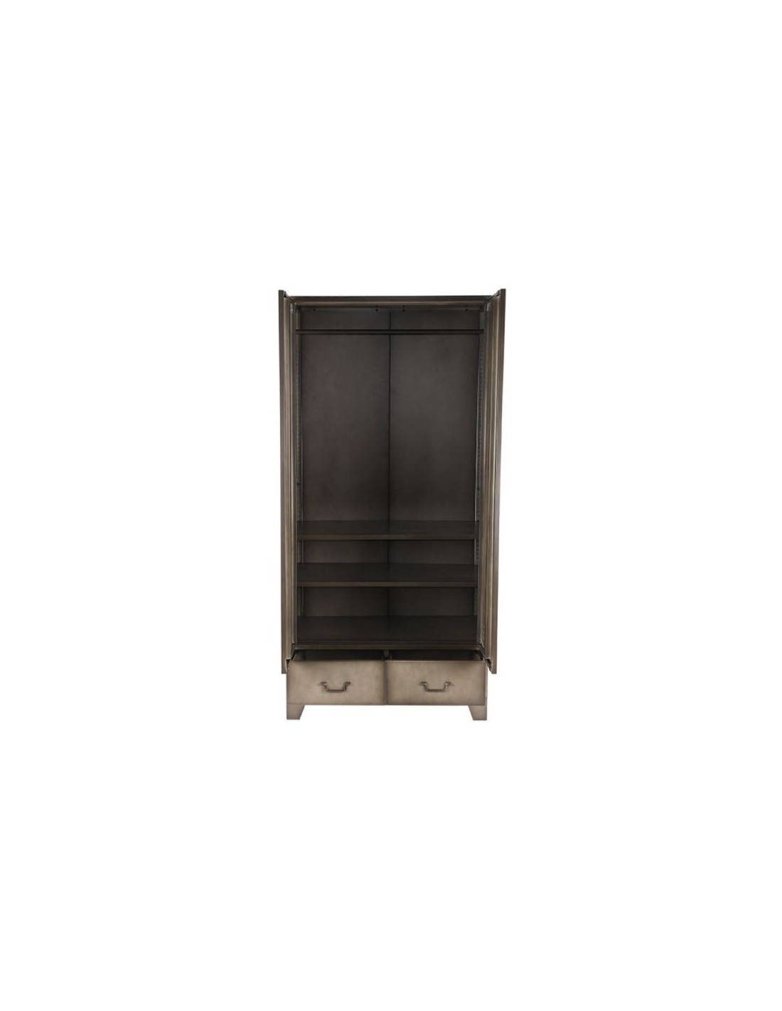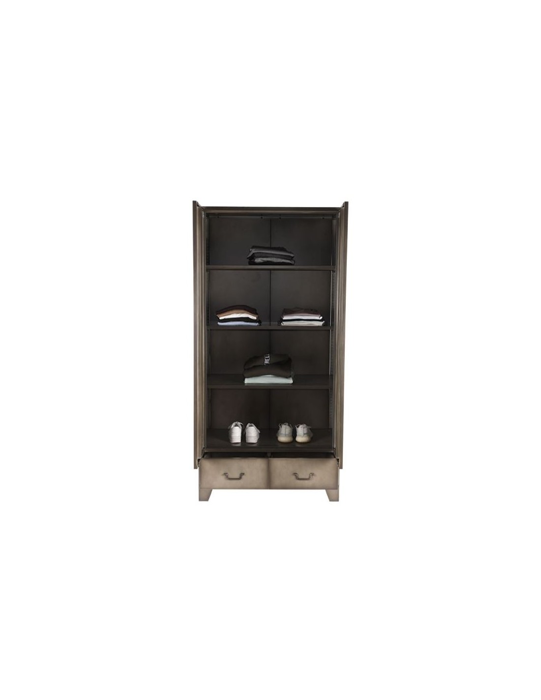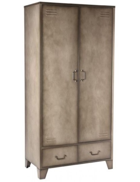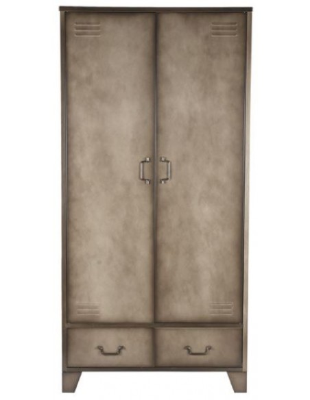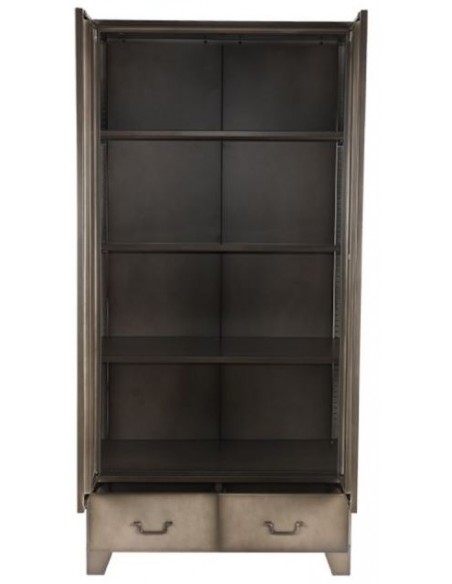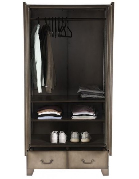 Skab udført i et industrielt design, fremstillet i industrielt vintage metalgrå lakeret metal. I skabet forefindes 3 hylder samt 1 bøjlestang og 2 skuffer, således du selv kan indrette skabet efter behov. Skabet måler 185 cm i højden og 90 x 50 cm i bredde og dybde.