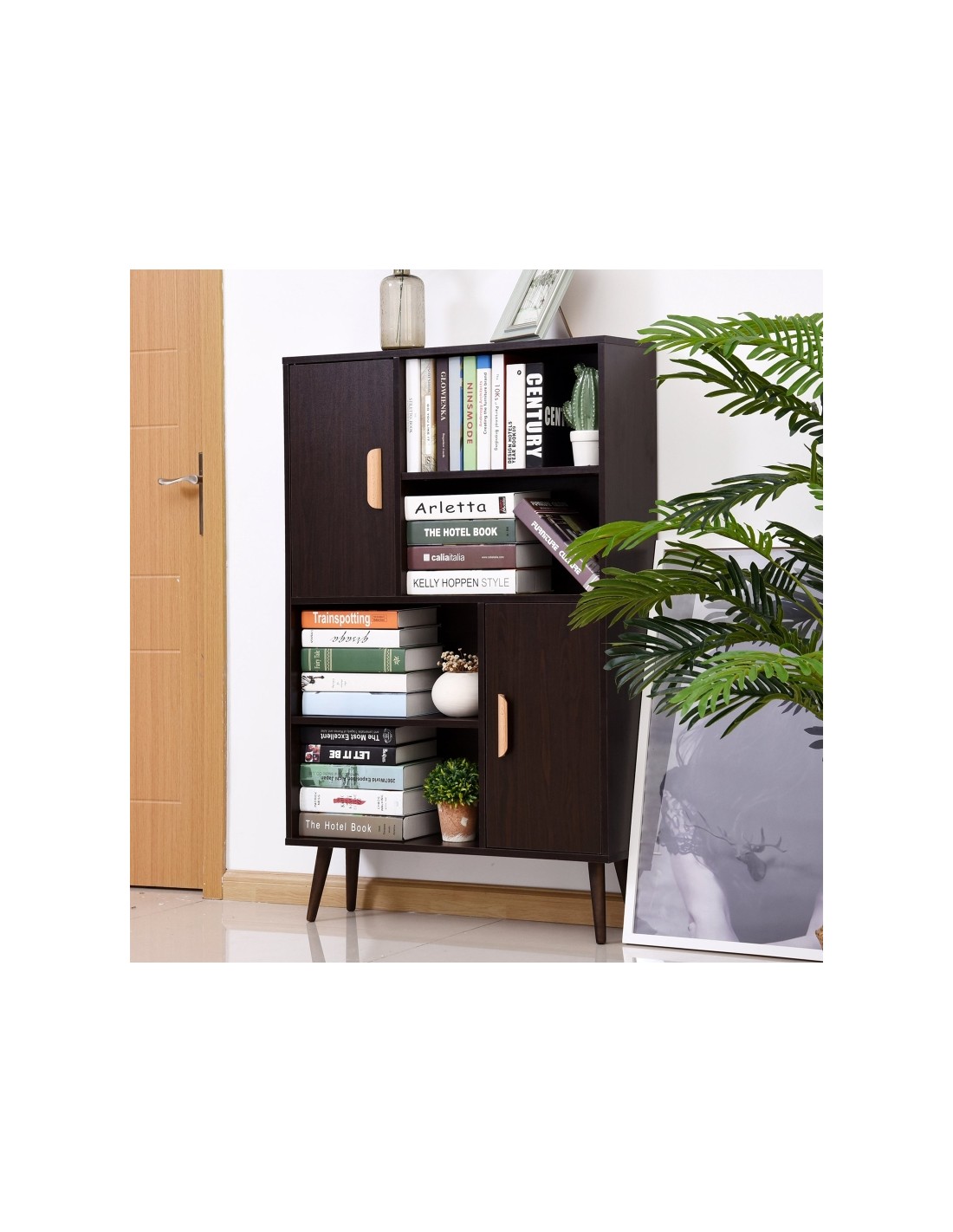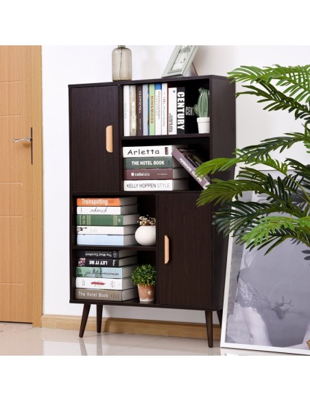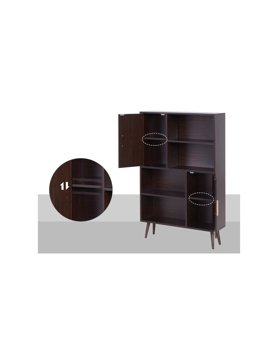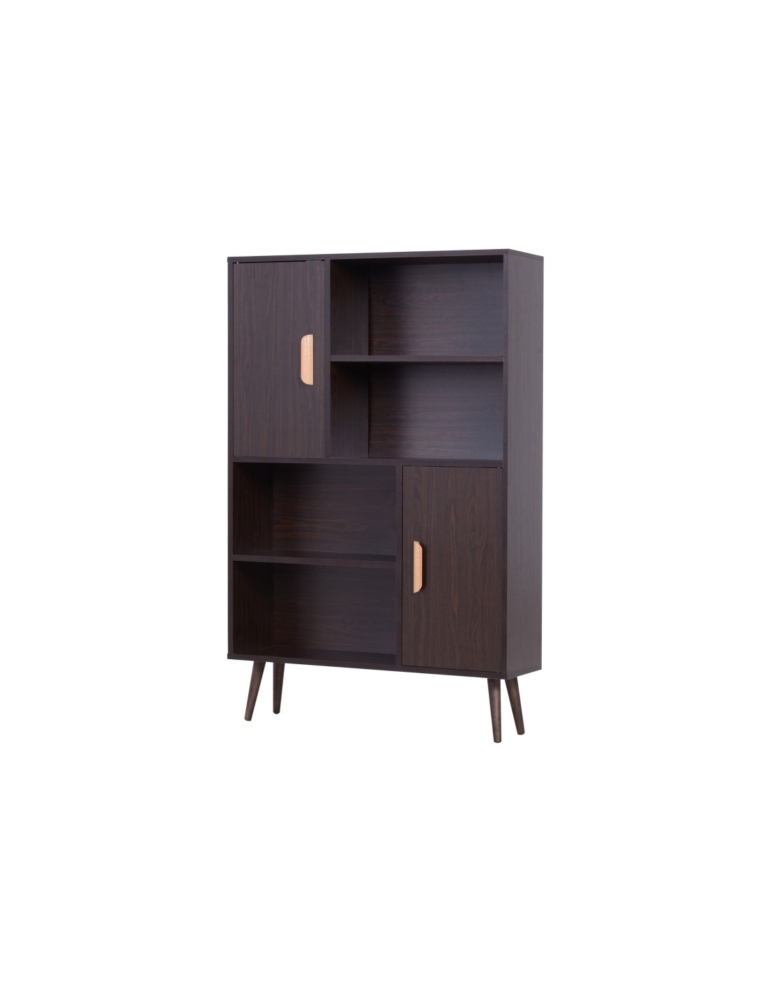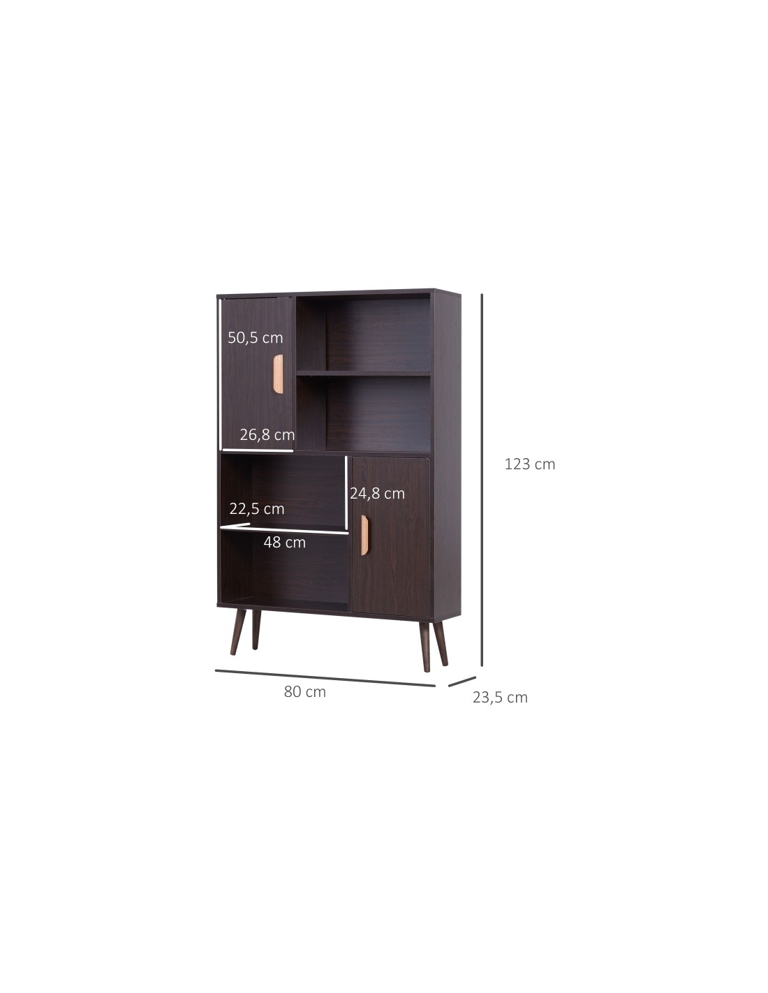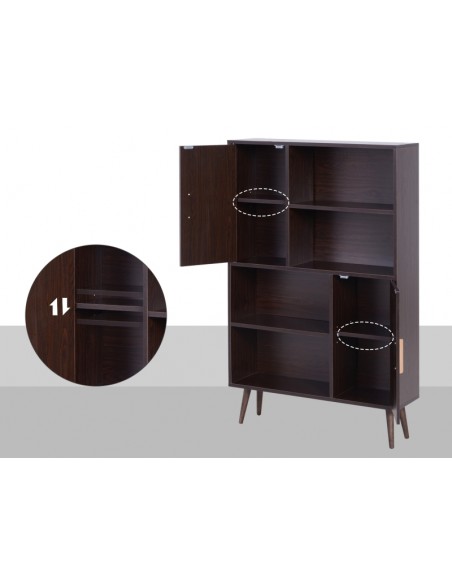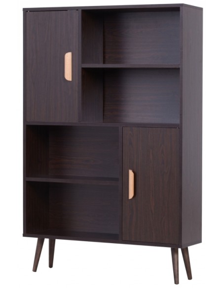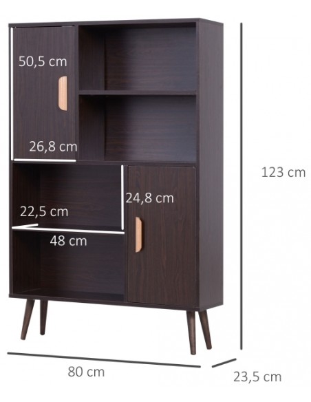 Skabsreol udført i et design af møbelplade og fyrretræ. Skabsreolen måler 80 x 23,5 cm i bredde og dybde og 123 cm i højden. Reolen kommer med 4 åbne hylderum og 2 skabe, hvert med 2 hylderum med justerbar hylde.