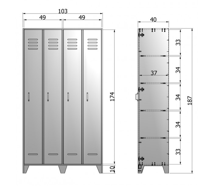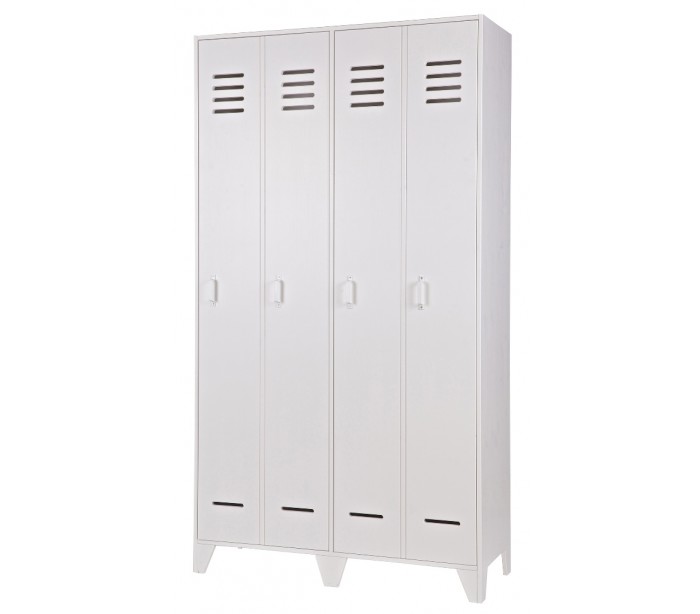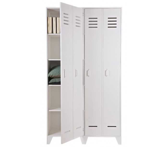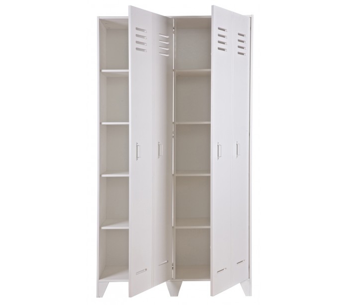 Skab i et moderne design, fremstillet i hvidlakeret fyrretræ. Skabet indeholder i alt 10 hylderum og måler 187 cm i højden og 103 x 40 cm i bredde og dybde.