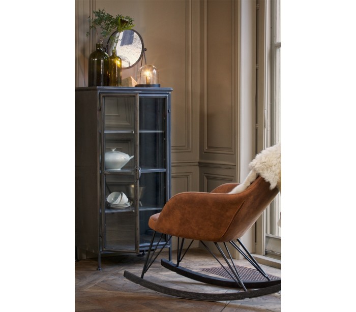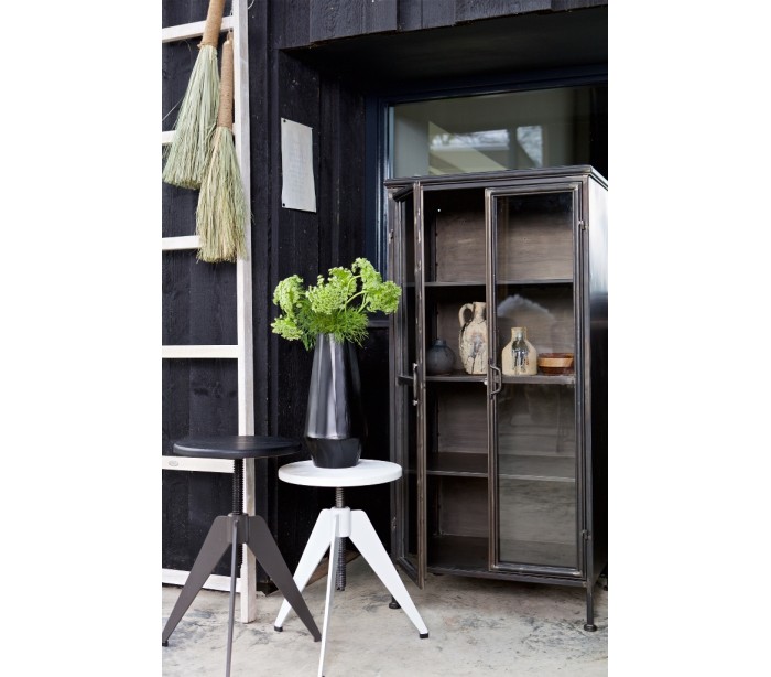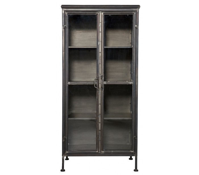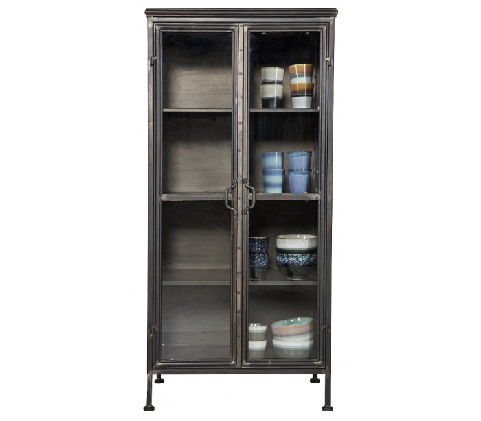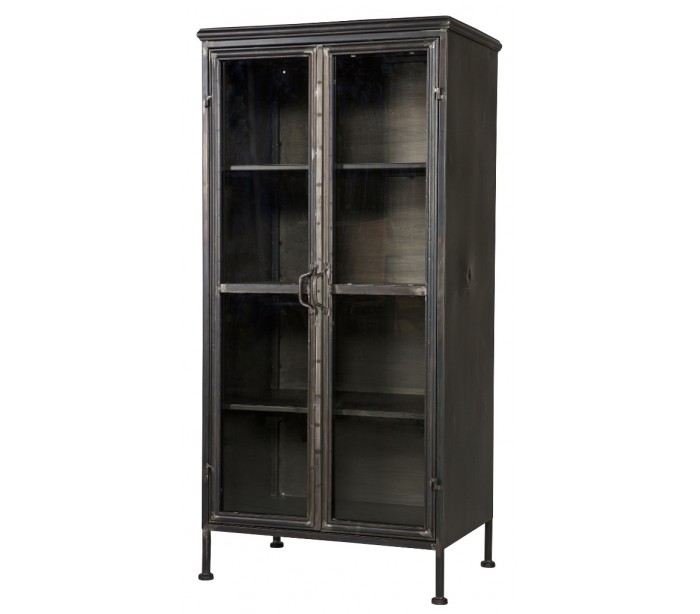 Skab i et industrielt design, fremstillet i rå lakeret metal. Skabet indeholder 4 dobbelte hylderum bag lågerne og måler 124 cm i højden og 59 x 41 cm i bredde og dybde.