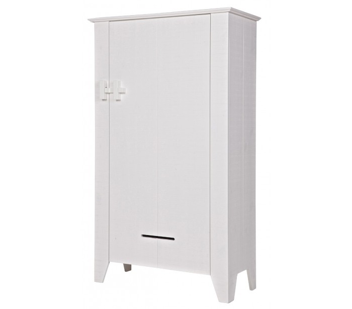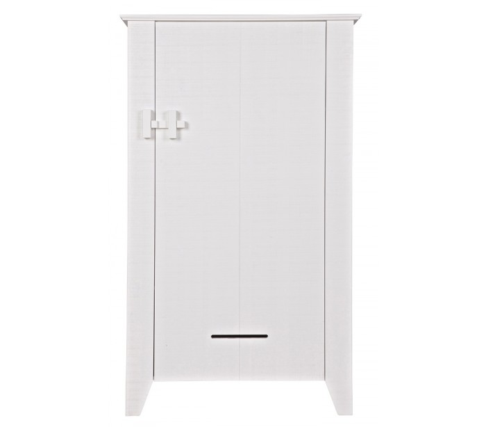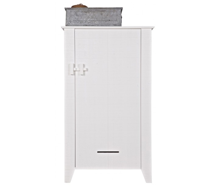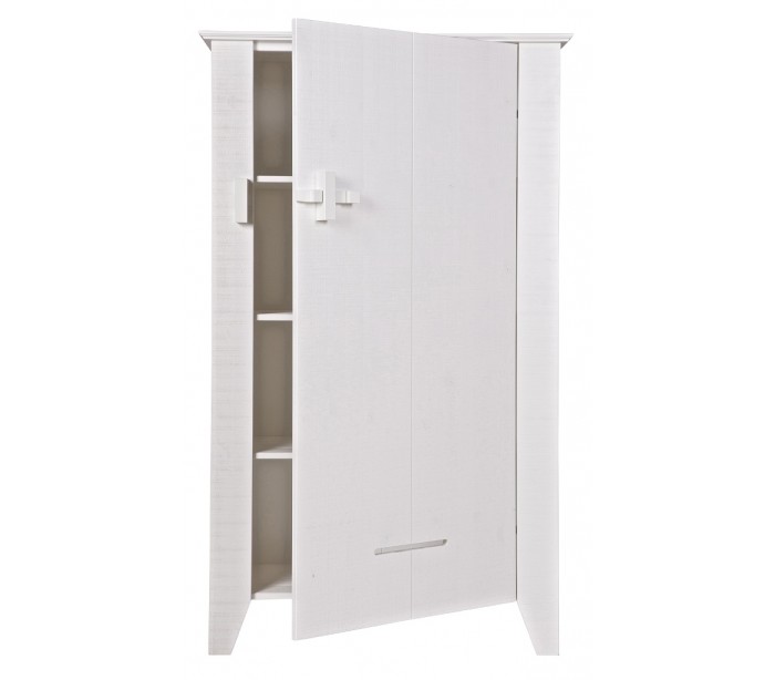 Skab i et moderne design, fremstillet i børstet hvidlakeret fyrretræ. Skabet indeholder 4 hylderum bag lågen og måler 142 cm i højden og 85 x 38 cm i bredde og dybde.