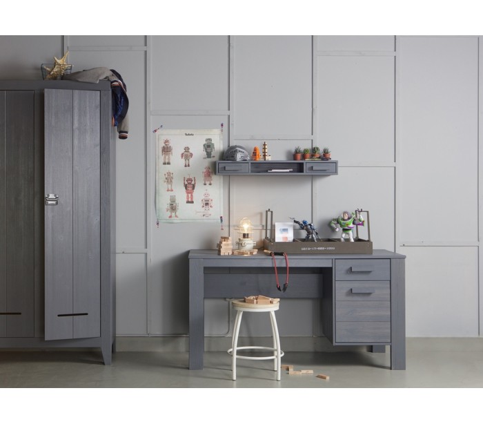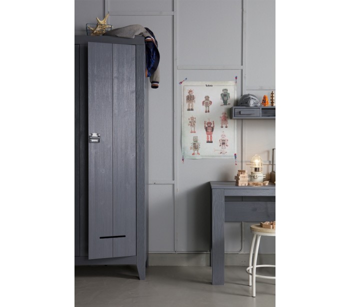 Skab i et moderne design, fremstillet i børstet stålgråt lakeret fyrretræ. Skabet indeholder i alt 10 hylderum og måler 190 cm i højden og 95 x 44 cm i bredde og dybde.