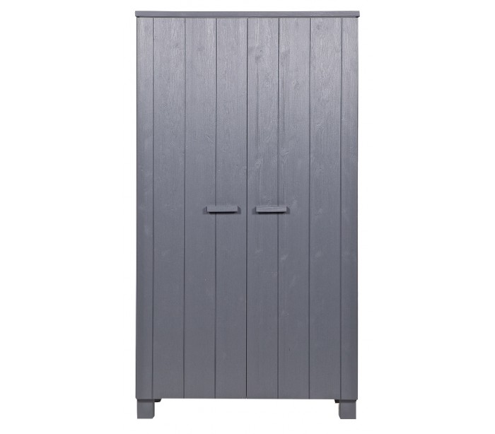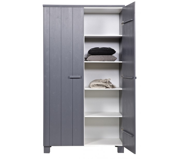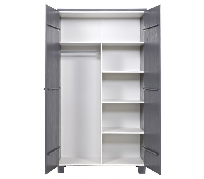 Skab i et moderne design, fremstillet i børstet stålgråt lakeret fyrretræ. Skabet indeholder 5 hylderum og 1 bøjlestang og måler 202 cm i højden og 111 x 55 cm i bredde og dybde.