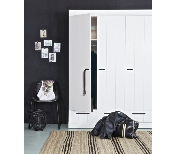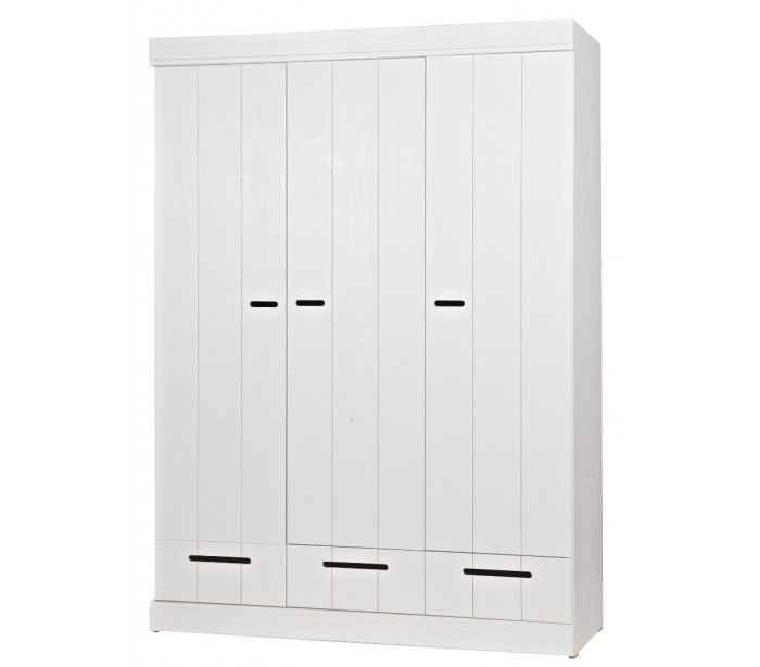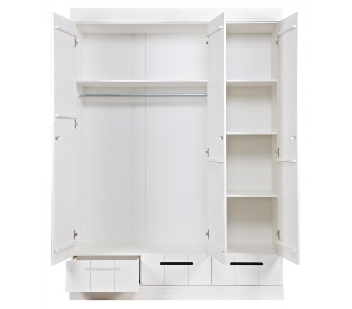 Klædeskab i et moderne design, fremstillet i hvidlakeret fyrretræ. Skabet indeholder 3 skuffer, 5 hylderum og 1 bøjlestang. Skabet måler 195 cm i højden og 140 x 53 cm i bredde og dybde.