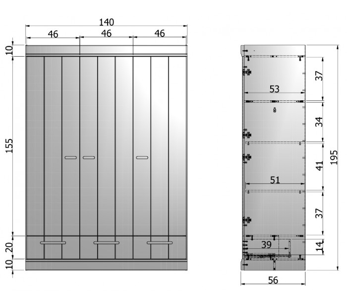 • 3 skuffer, 5 hylderum og 1 bøjlestang