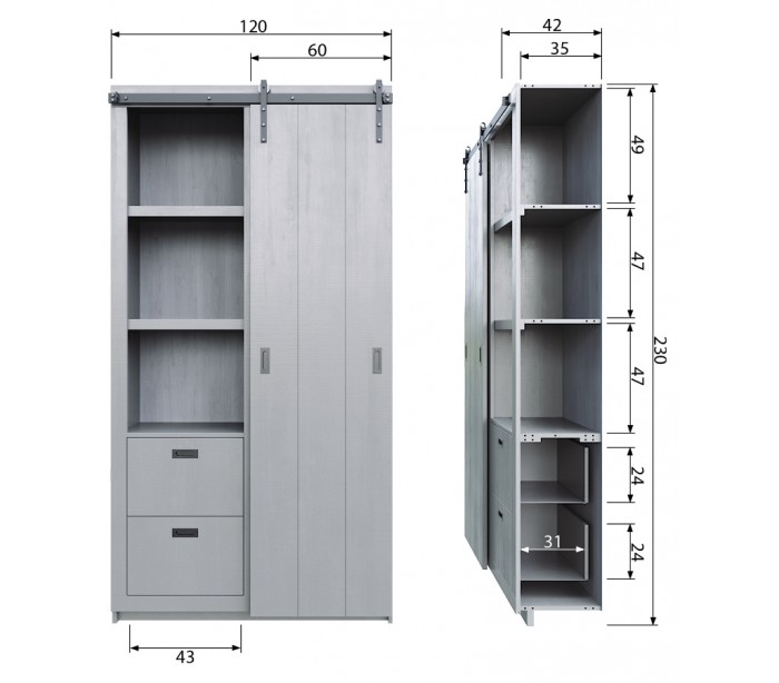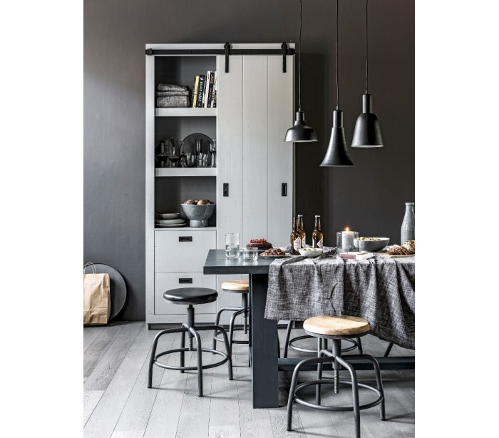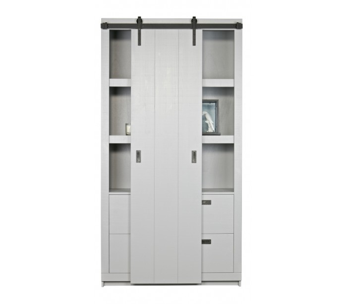 Skab med skydelåge i et rustikt design, fremstillet i børstet betongrå lakeret fyrretræ. Skabet indeholder 6 hylderum og 4 skuffer. Skabet måler 232 cm i højden og 122 x 37 cm i bredde og dybde.