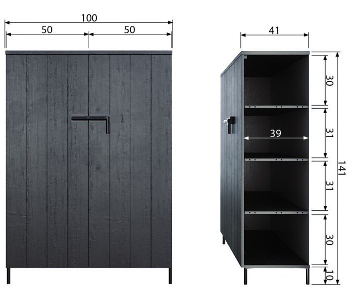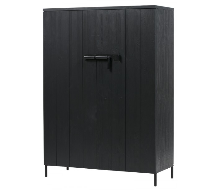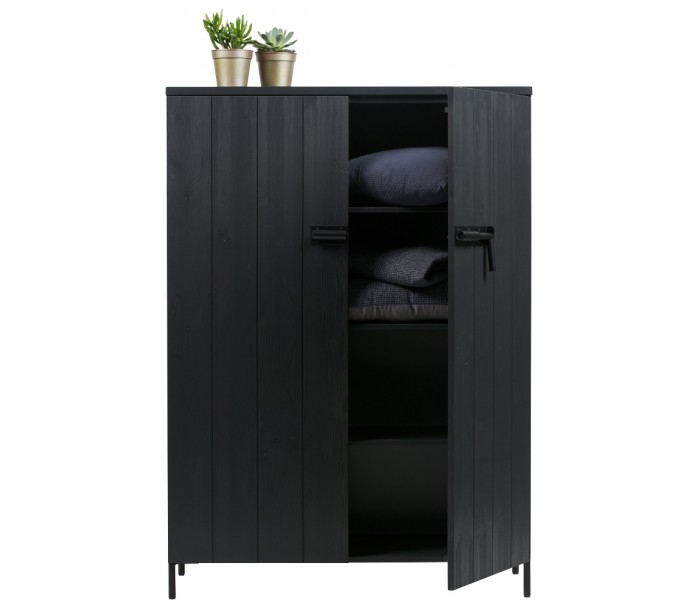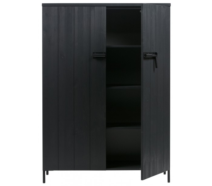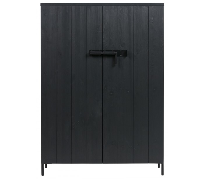 Skab i et moderne design, fremstillet i børstet sortlakeret fyrretræ. Skabet indeholder 4 hylderum bag lågerne og måler 141 cm i højden og 100 x 41,5 cm i bredde og dybde.