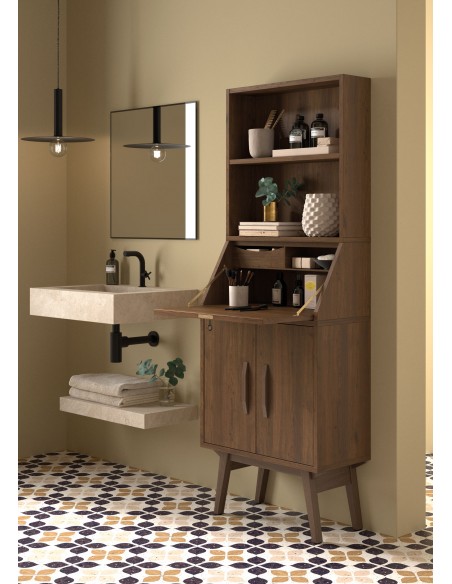 Auxiliar sekretær skab til badeværelset, eller andre rum hvor skabet ønskes at stå. Skabet er udført i lakeret Roble træ, og kommer med 2 åben hylderum, 1 dobbeltskab med 2 hylderum, samt 1 sekretær sektion med låge der åbnes og gemmer på 3 hylderum hvori der er 1 kasse til opbevaring. Hylden i skabet er højdejustérbar.