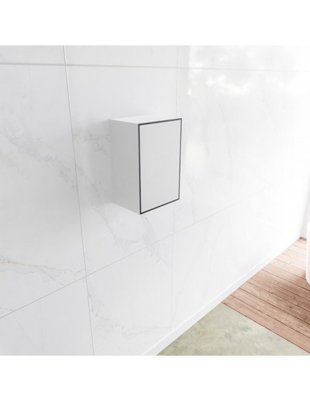 LAGOM skab til badeværelset, udført i et moderne og stilrent design i det solide materiale "Solid Surface", der ikke alene giver badeværelset et stilrent design, men samtidig er lækkert at røre ved. Skabet er med højrevendt push-open skabslåge (åbner med uret). Skabet måler 45 x 30 cm i højde og bredde (ydermål).