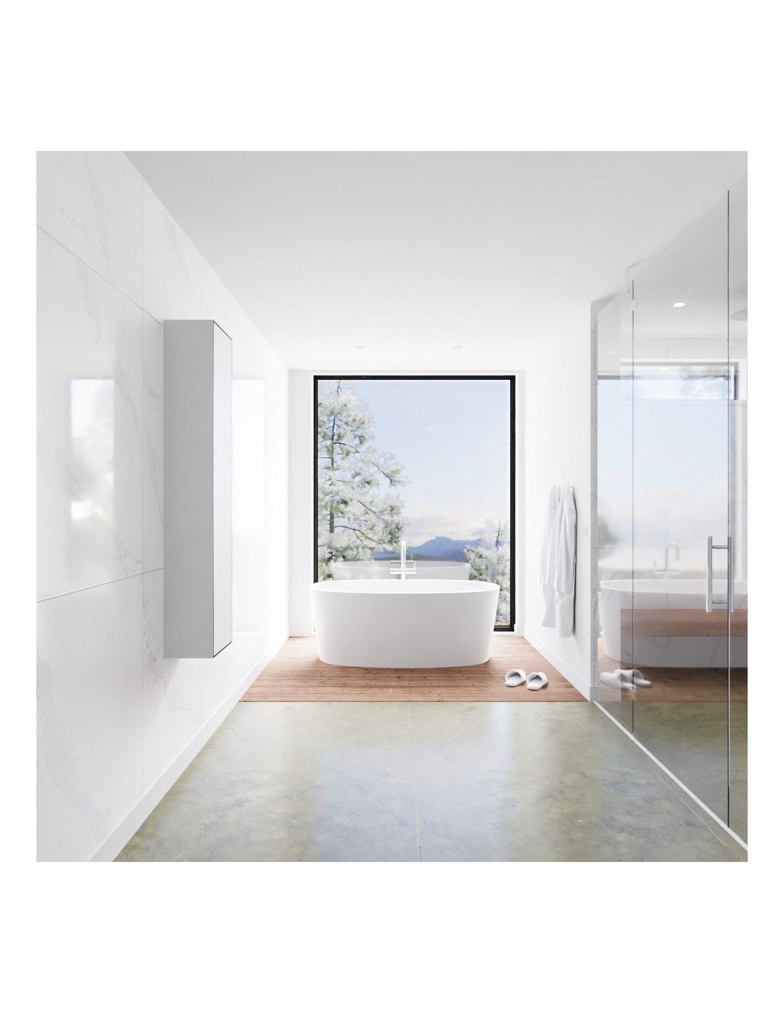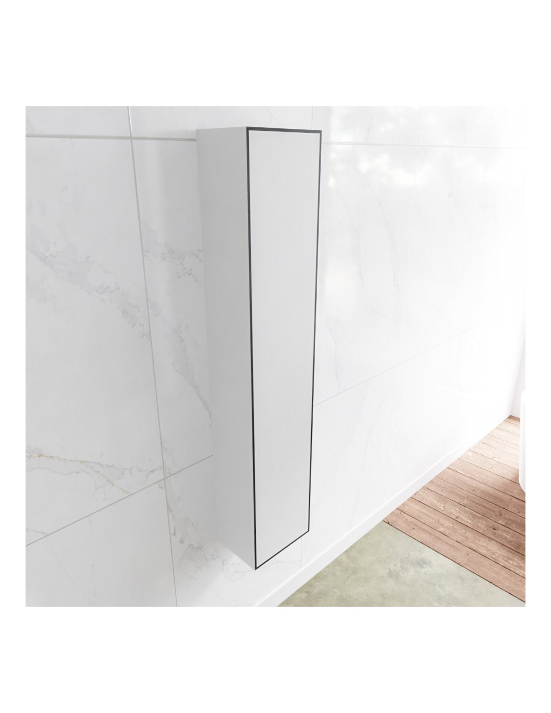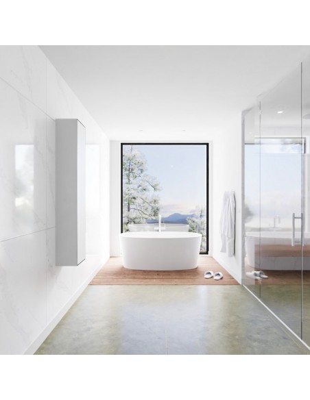 LAGOM skab til badeværelset, udført i et moderne og stilrent design i det solide materiale "Solid Surface", der ikke alene giver badeværelset et stilrent design, men samtidig er lækkert at røre ved. Skabet er med venstrevendt push-open skabslåge (åbner mod uret). Skabet måler 150 x 30 cm i højde og bredde (ydermål).