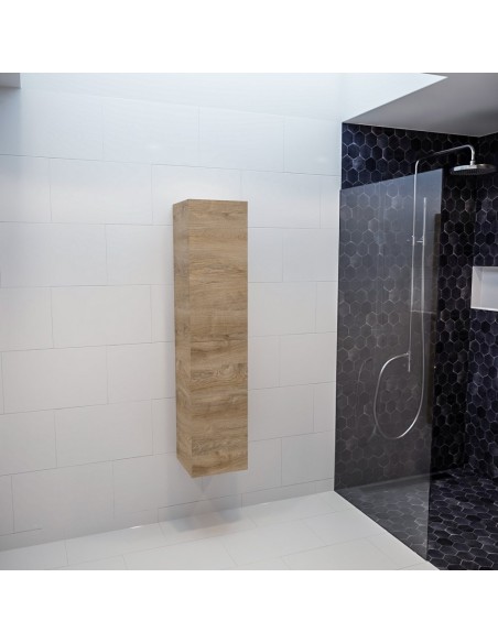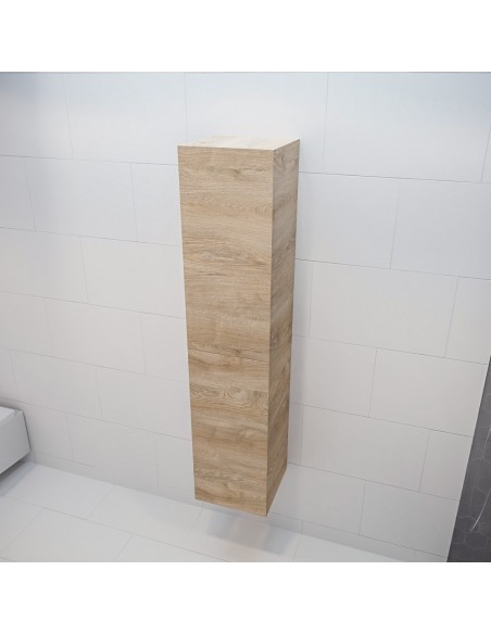 BEAM højskab til badeværelset, udført i et design af egetræsfarvet MDF. Skabet kan spejlvendes og leveres med 2 softclose skabslåger. Hvert skab indeholder 2 hylderum. Skabet måler 160 x 35 cm i højde og bredde (ydermål).