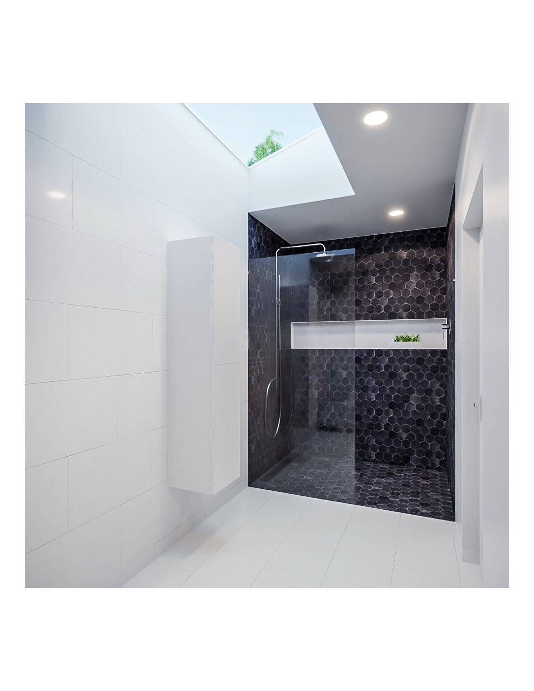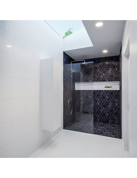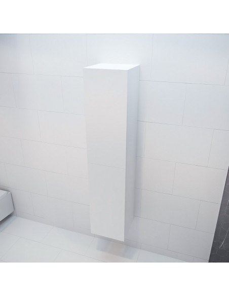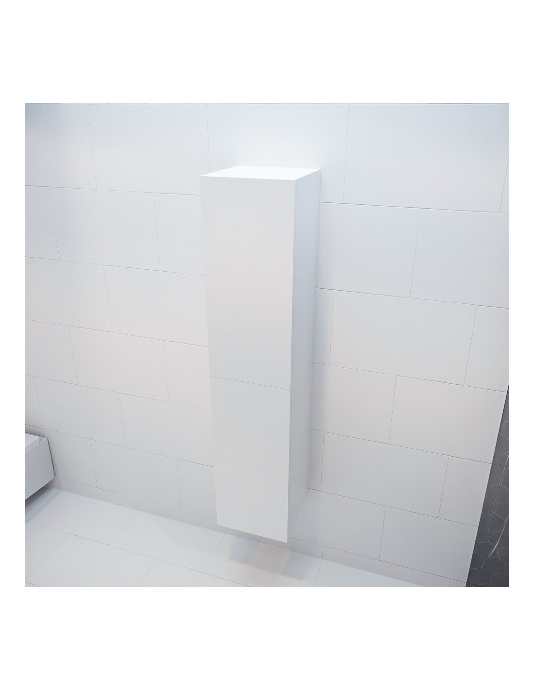 BEAM højskab til badeværelset, udført i et design af talkumsfarvet (mat hvid) MDF. Skabet kan spejlvendes og leveres med 2 softclose skabslåger. Hvert skab indeholder 2 hylderum. Skabet måler 160 x 35 cm i højde og bredde (ydermål).