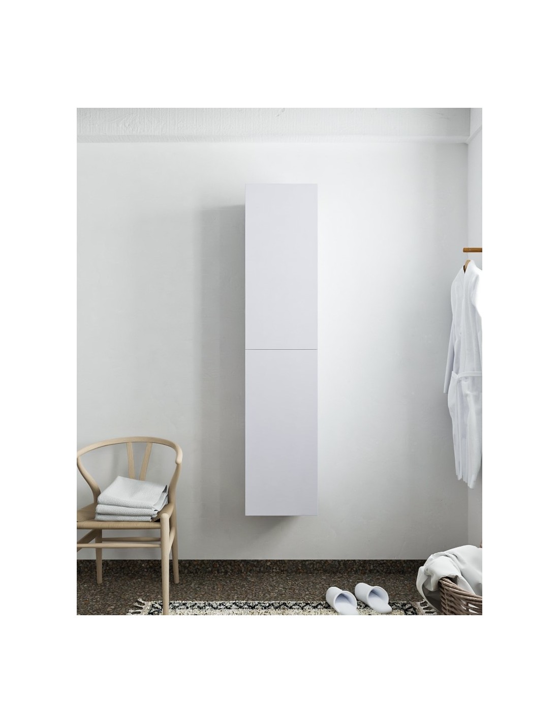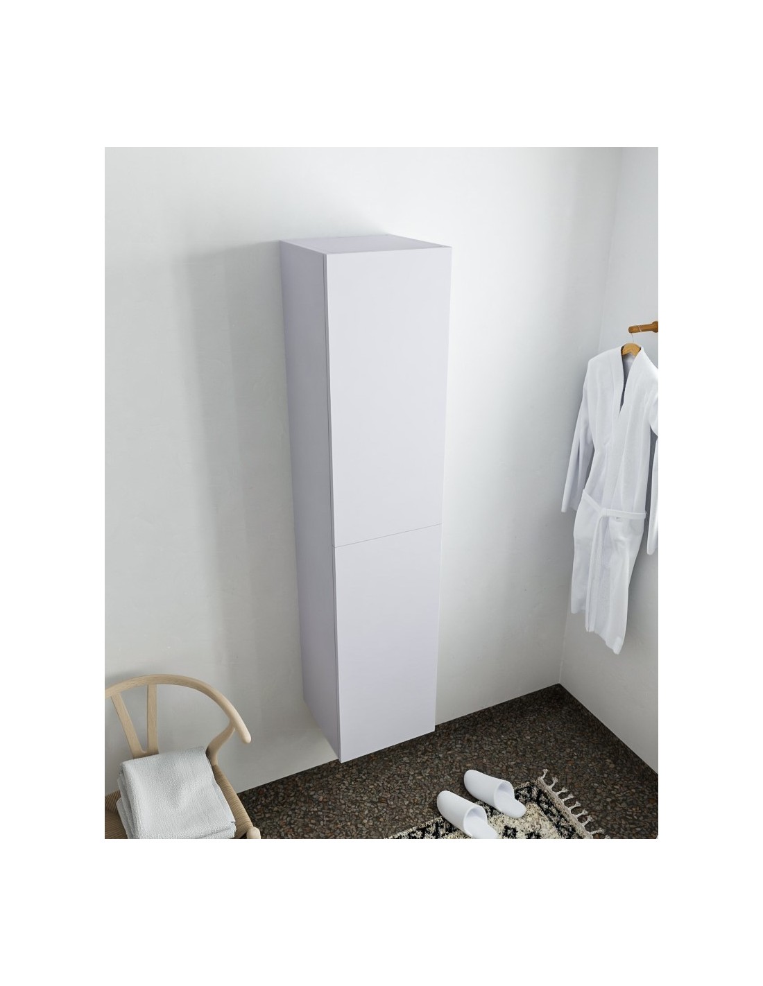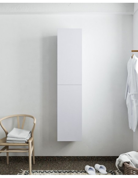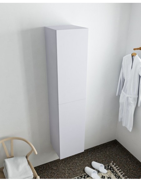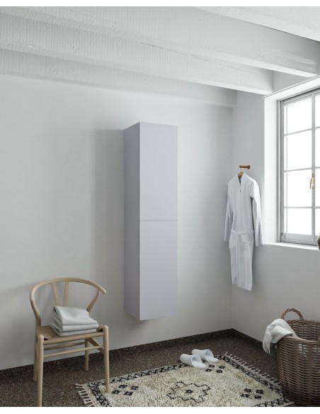 BEAM højskab til badeværelset, udført i et design af svag grå MDF. Skabet kan spejlvendes og leveres med 2 softclose skabslåger. Hvert skab indeholder 2 hylderum. Skabet måler 160 x 35 cm i højde og bredde (ydermål).