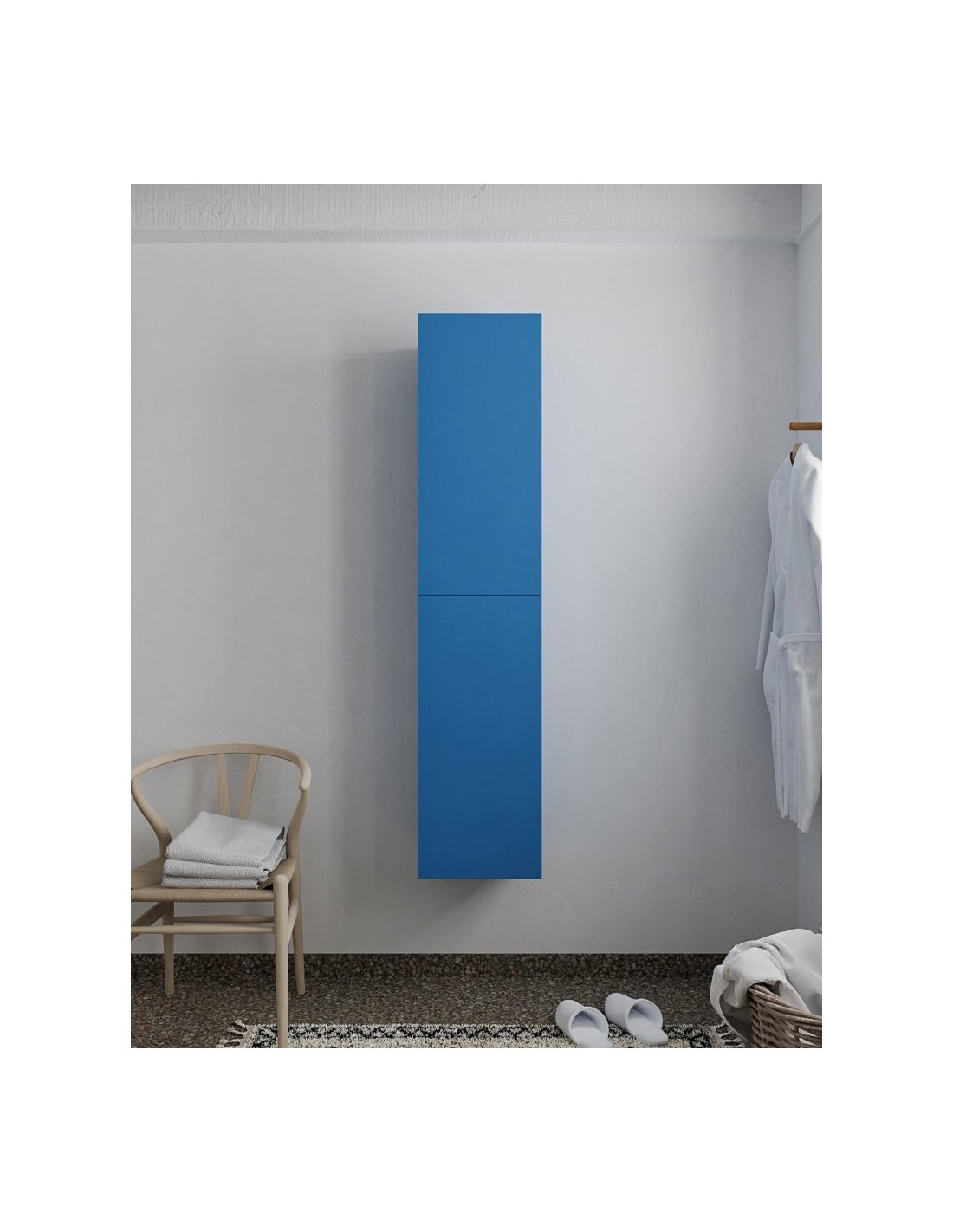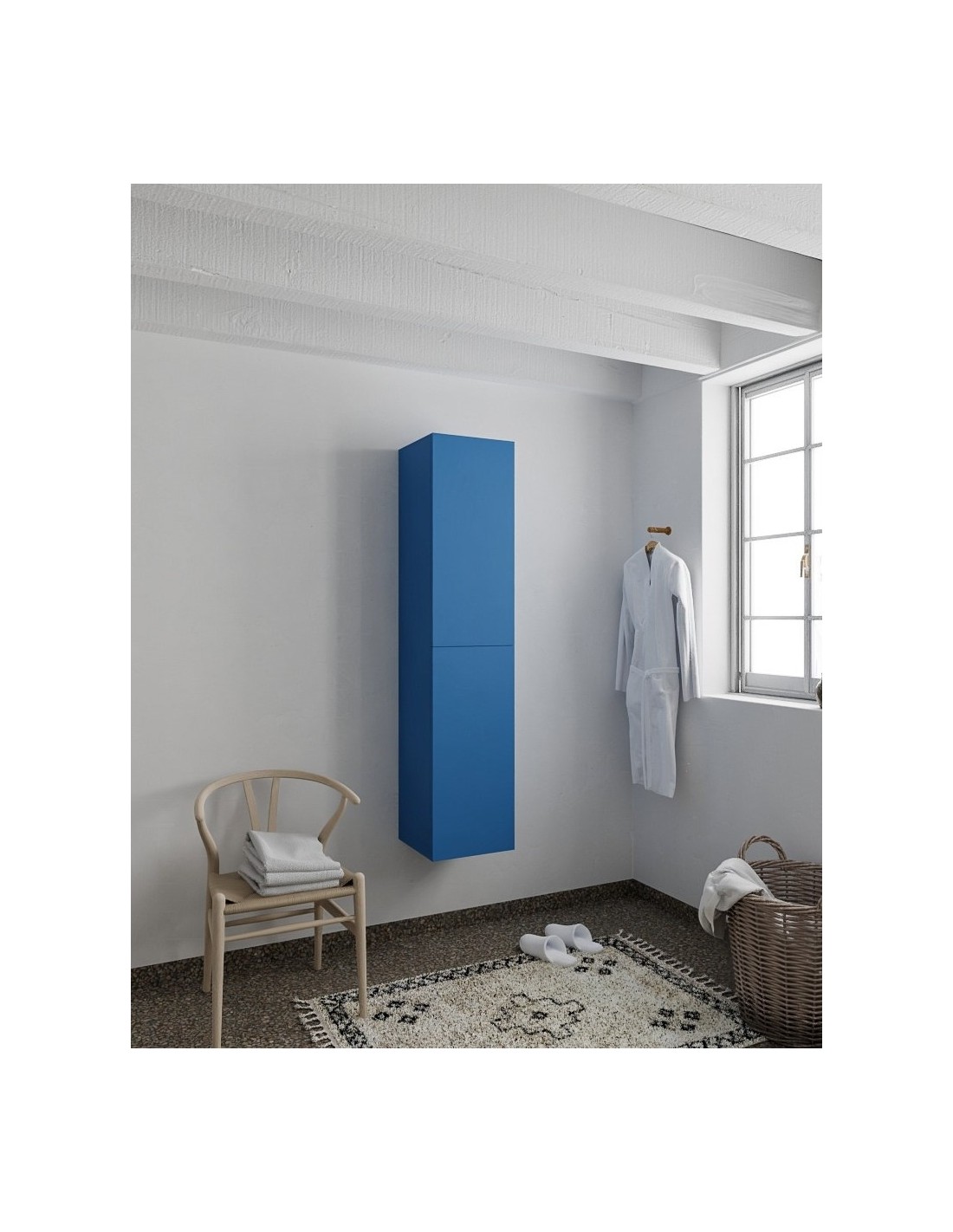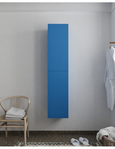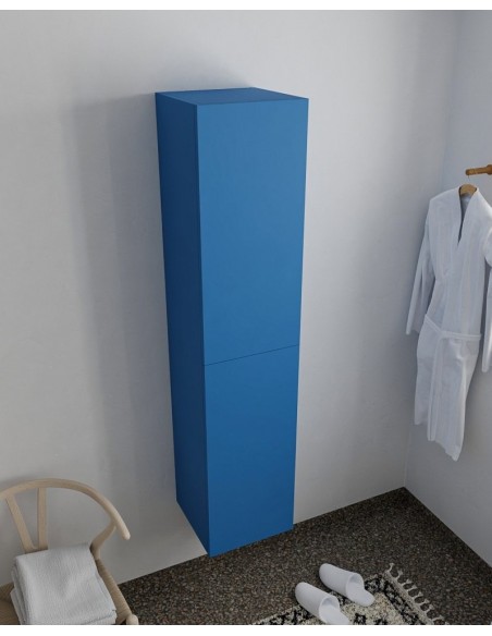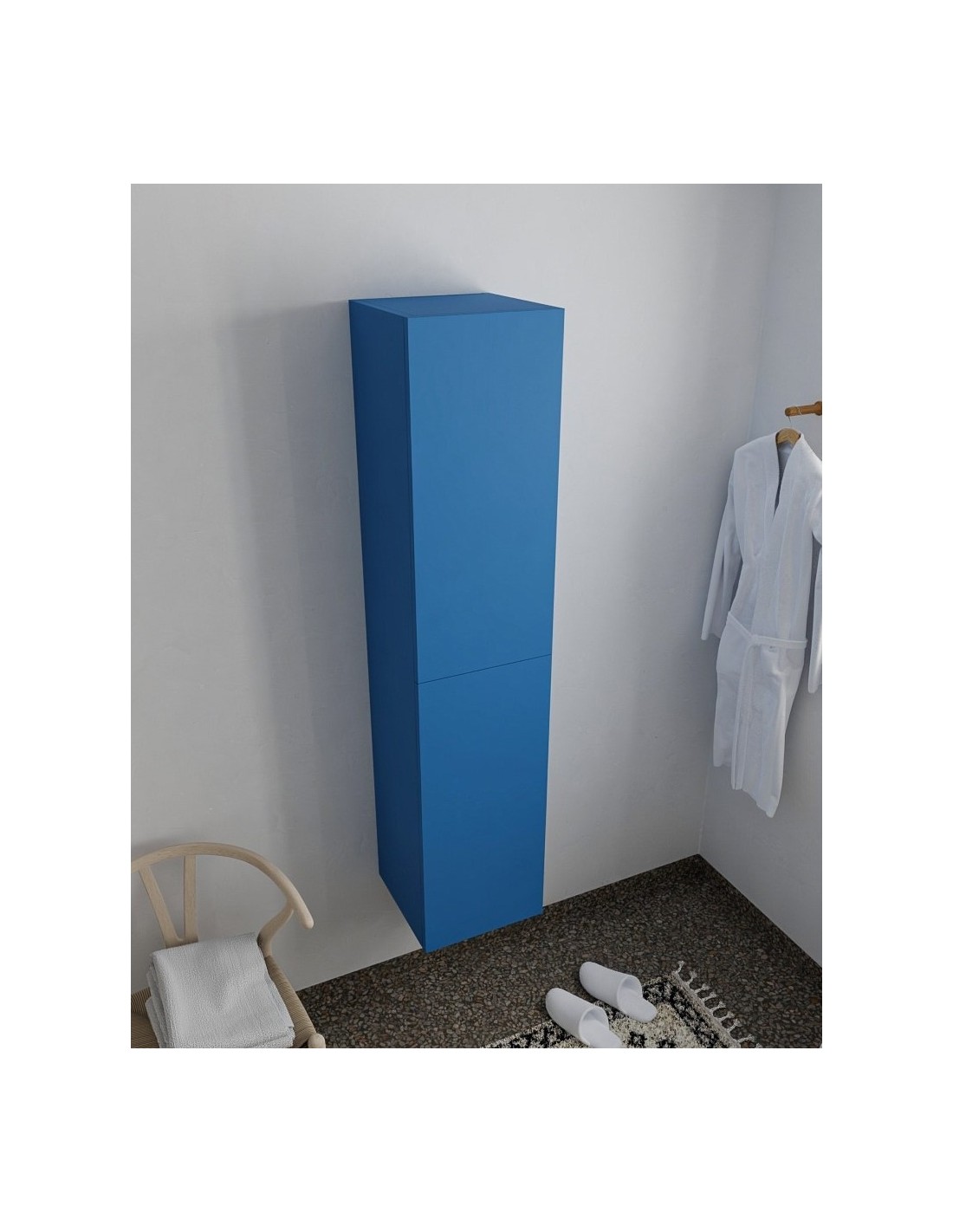 BEAM højskab til badeværelset, udført i et design af jeansblå MDF. Skabet kan spejlvendes og leveres med 2 softclose skabslåger. Hvert skab indeholder 2 hylderum. Skabet måler 160 x 35 cm i højde og bredde (ydermål).