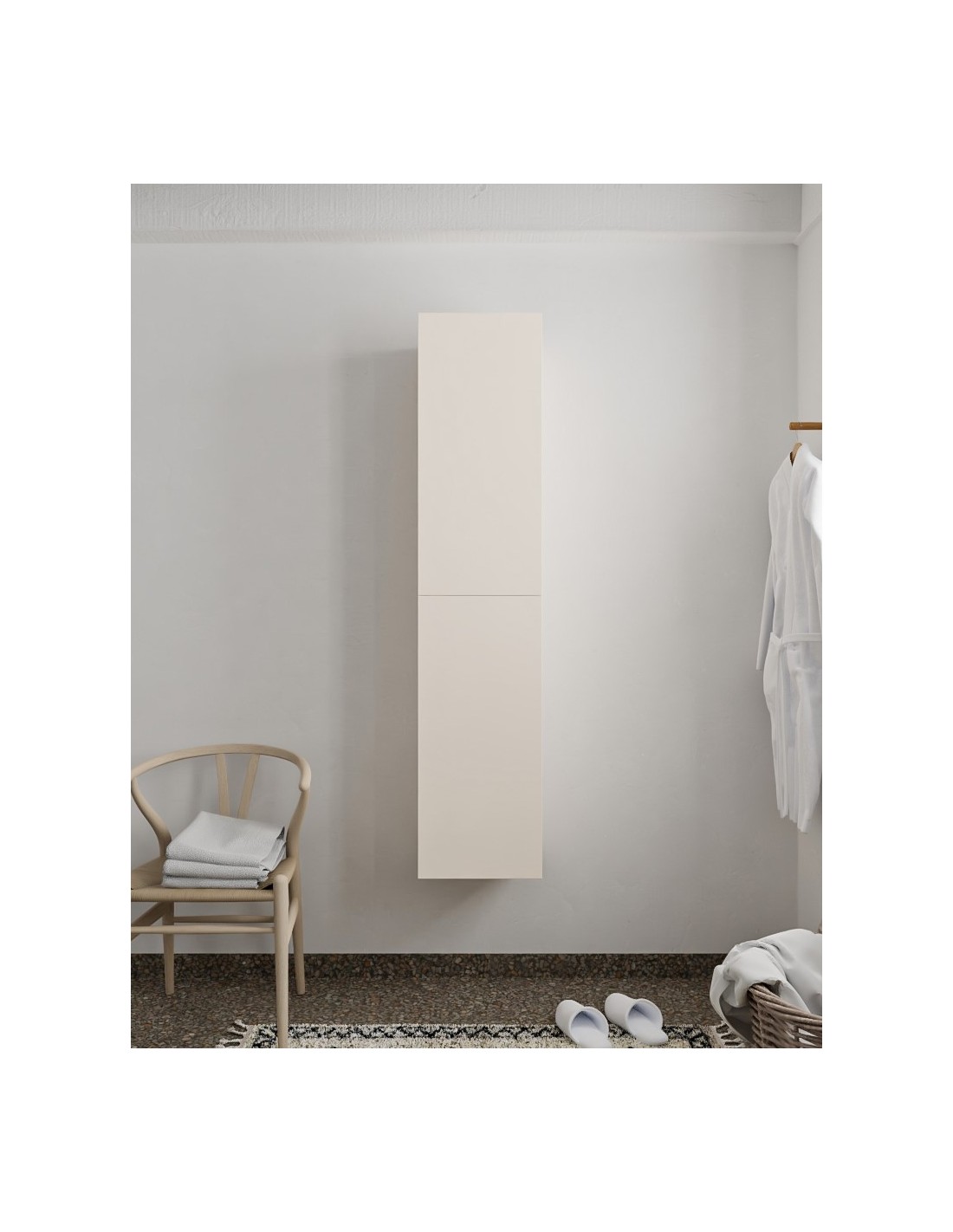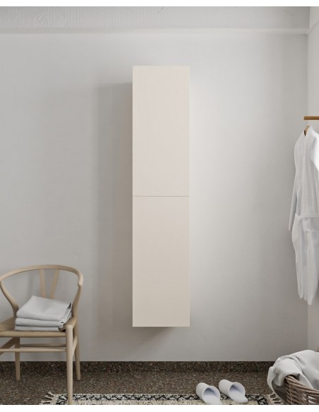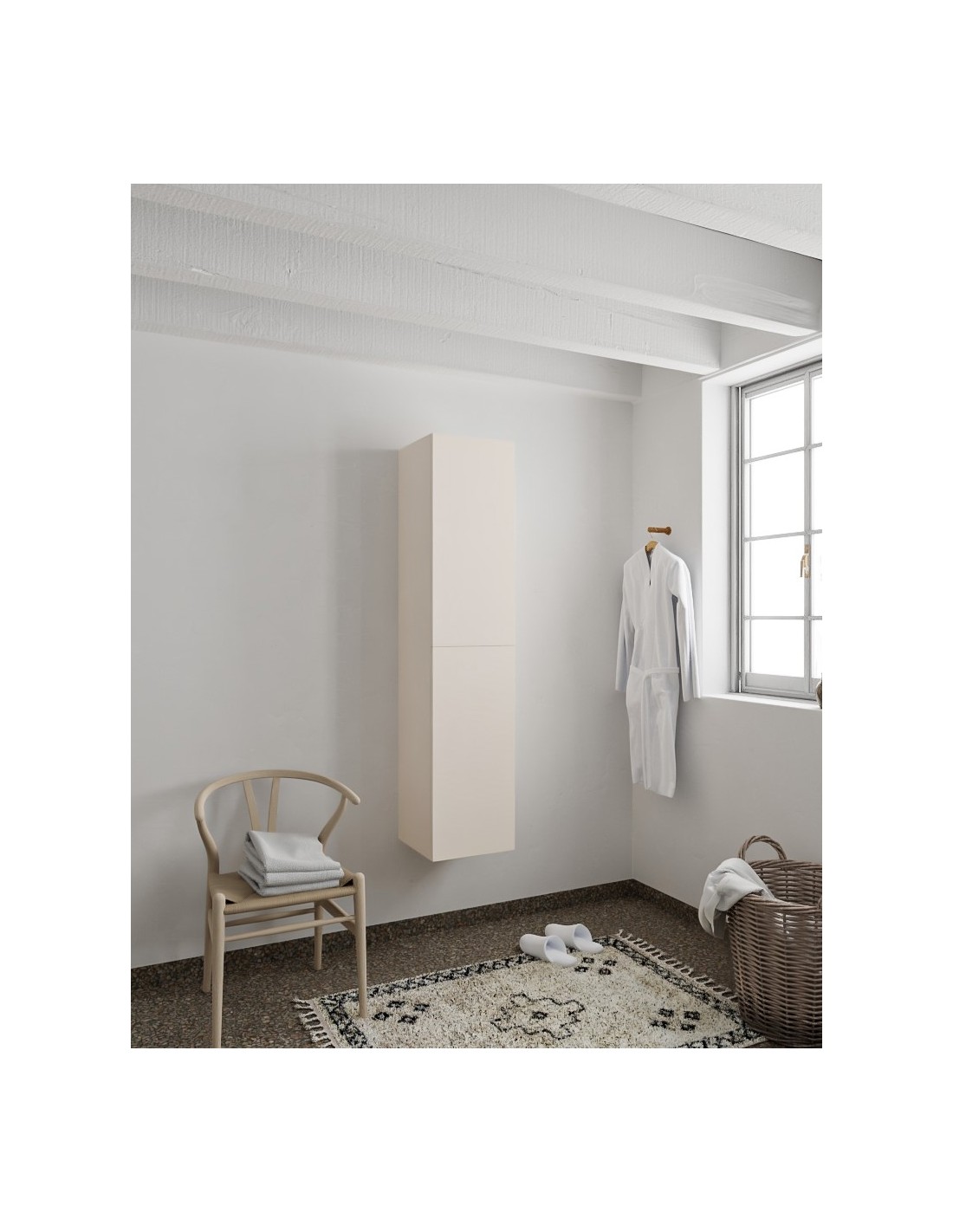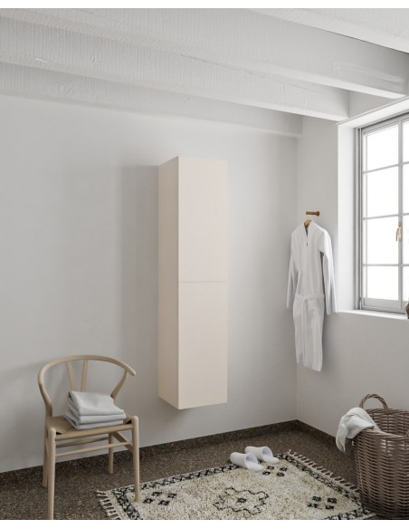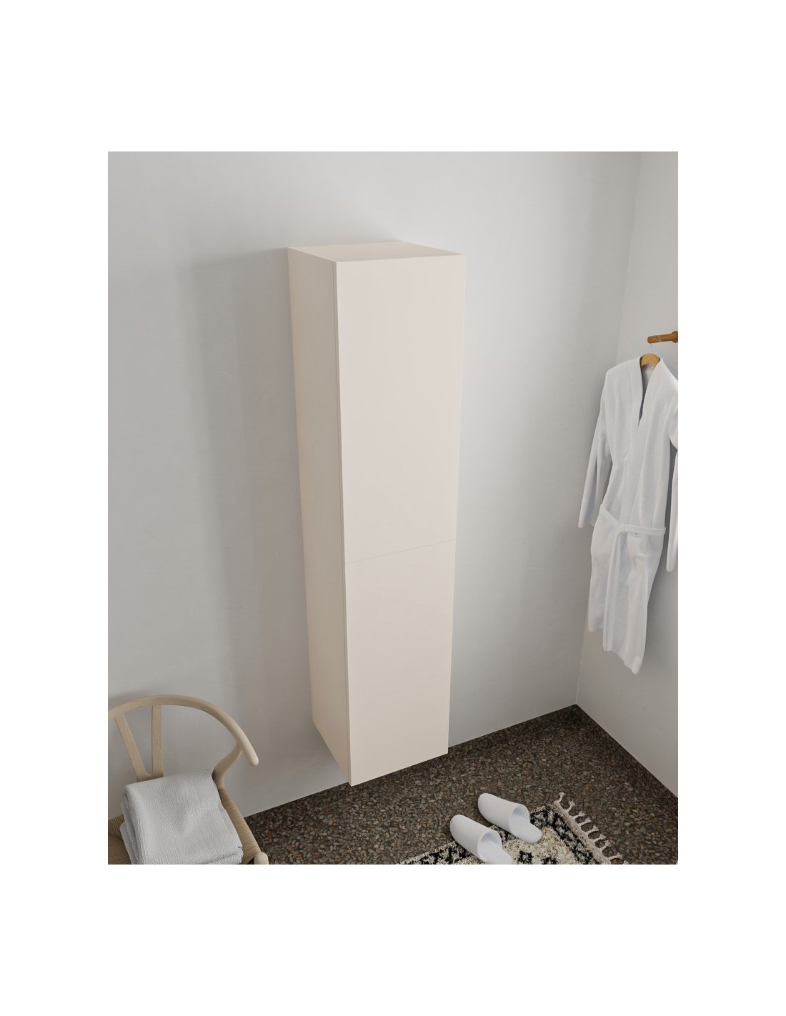 BEAM højskab til badeværelset, udført i et design af linnedfarvet (beige) MDF. Skabet kan spejlvendes og leveres med 2 softclose skabslåger. Hvert skab indeholder 2 hylderum. Skabet måler 160 x 35 cm i højde og bredde (ydermål).