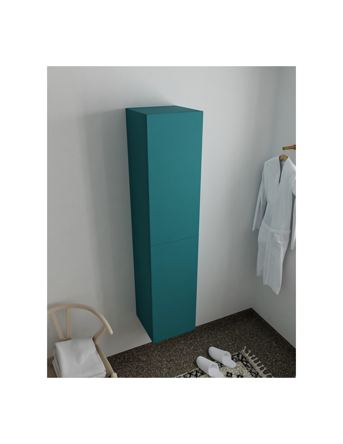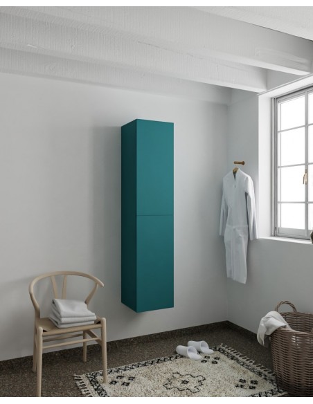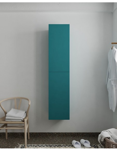 BEAM højskab til badeværelset, udført i et design af petroliumsfarvet MDF. Skabet kan spejlvendes og leveres med 2 softclose skabslåger. Hvert skab indeholder 2 hylderum. Skabet måler 160 x 35 cm i højde og bredde (ydermål).