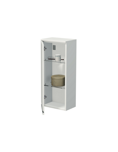 BRAVE Venstrevendt skab til badeværelset, udført i et moderne design af hvid højglans MDF. Skabet kommer med 2 hylder i glas, der kan justeres og med låge med softclose. Skabet måler 82 cm i højden og 35 cm i bredden.