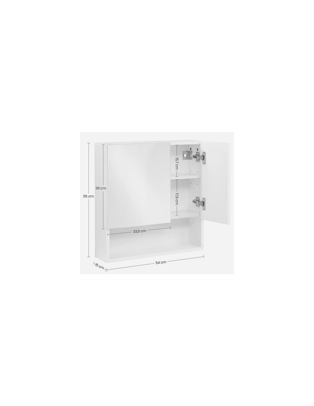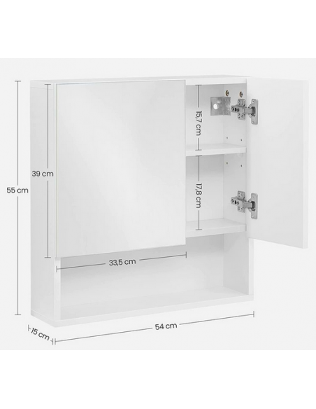 Spejlskab til badeværelset, udført i et design af mdf. Skabet måler 55 cm i højden og 54 x 15 cm i bredde og dybde. Skabet indeholder i alt 5 hylderum (4 stk. bag skabslåger og 1 åbent).