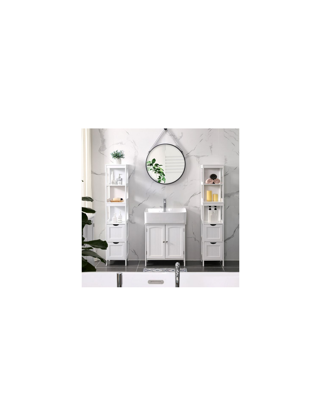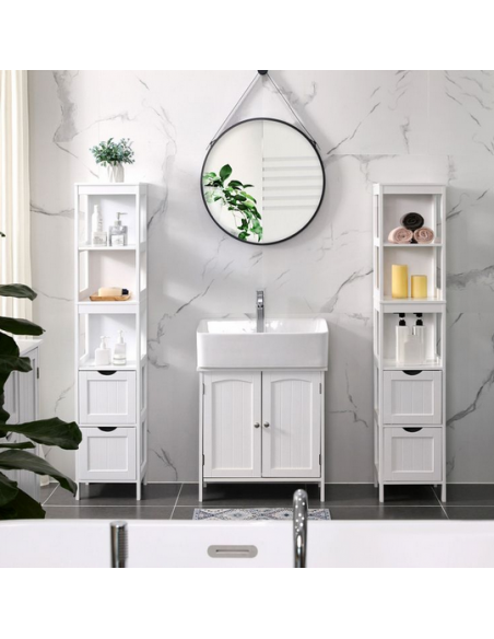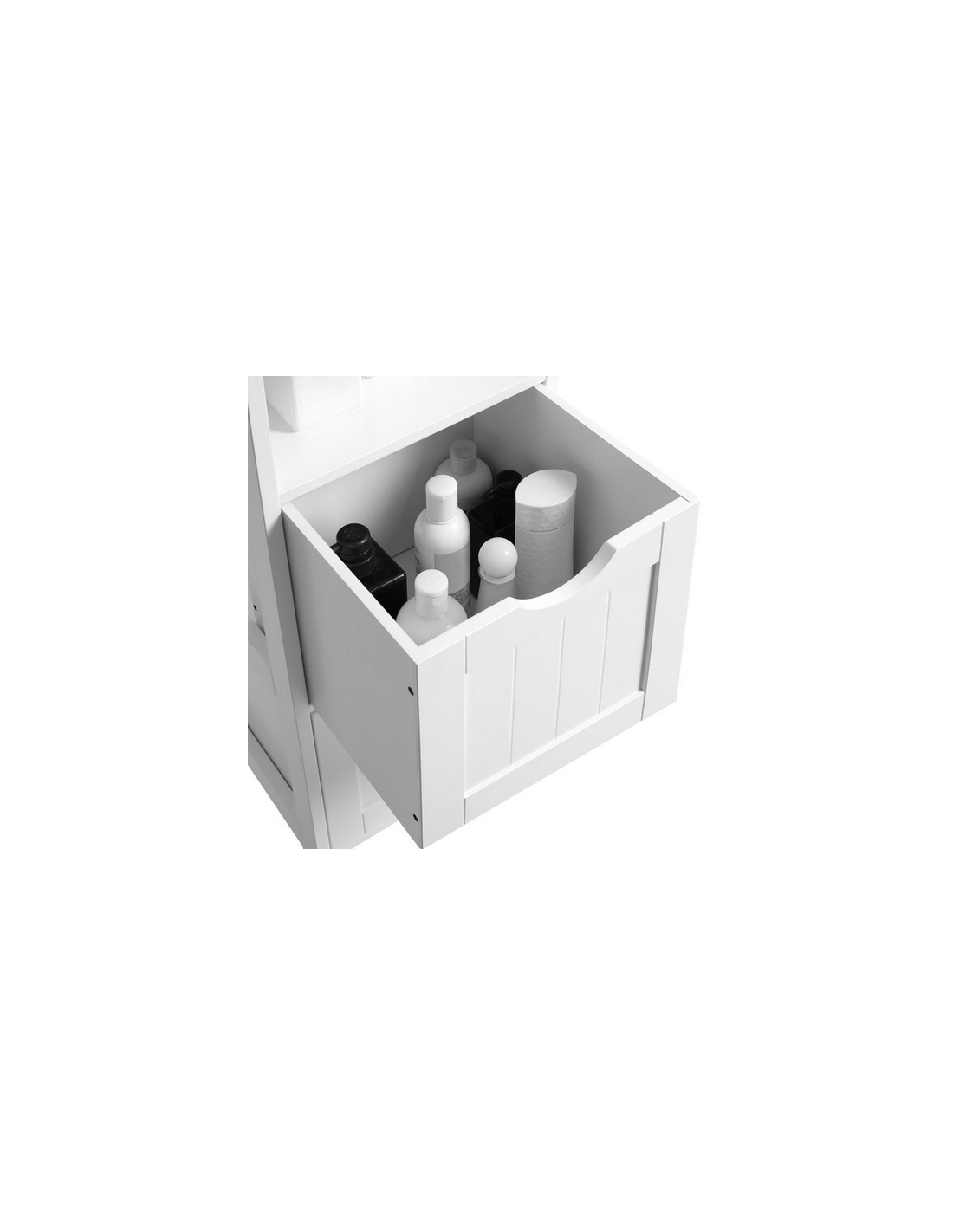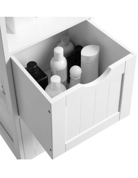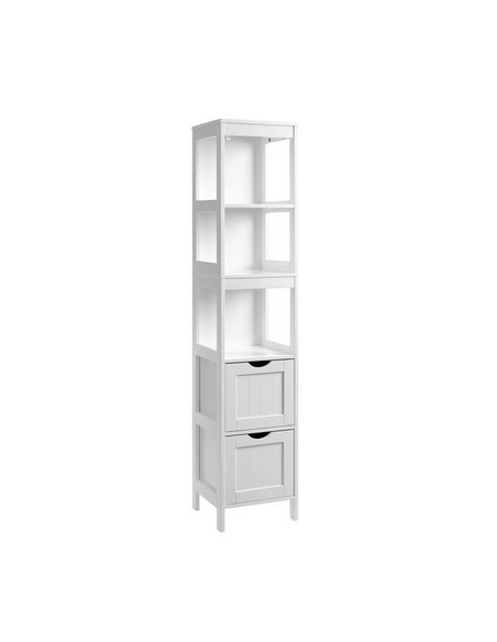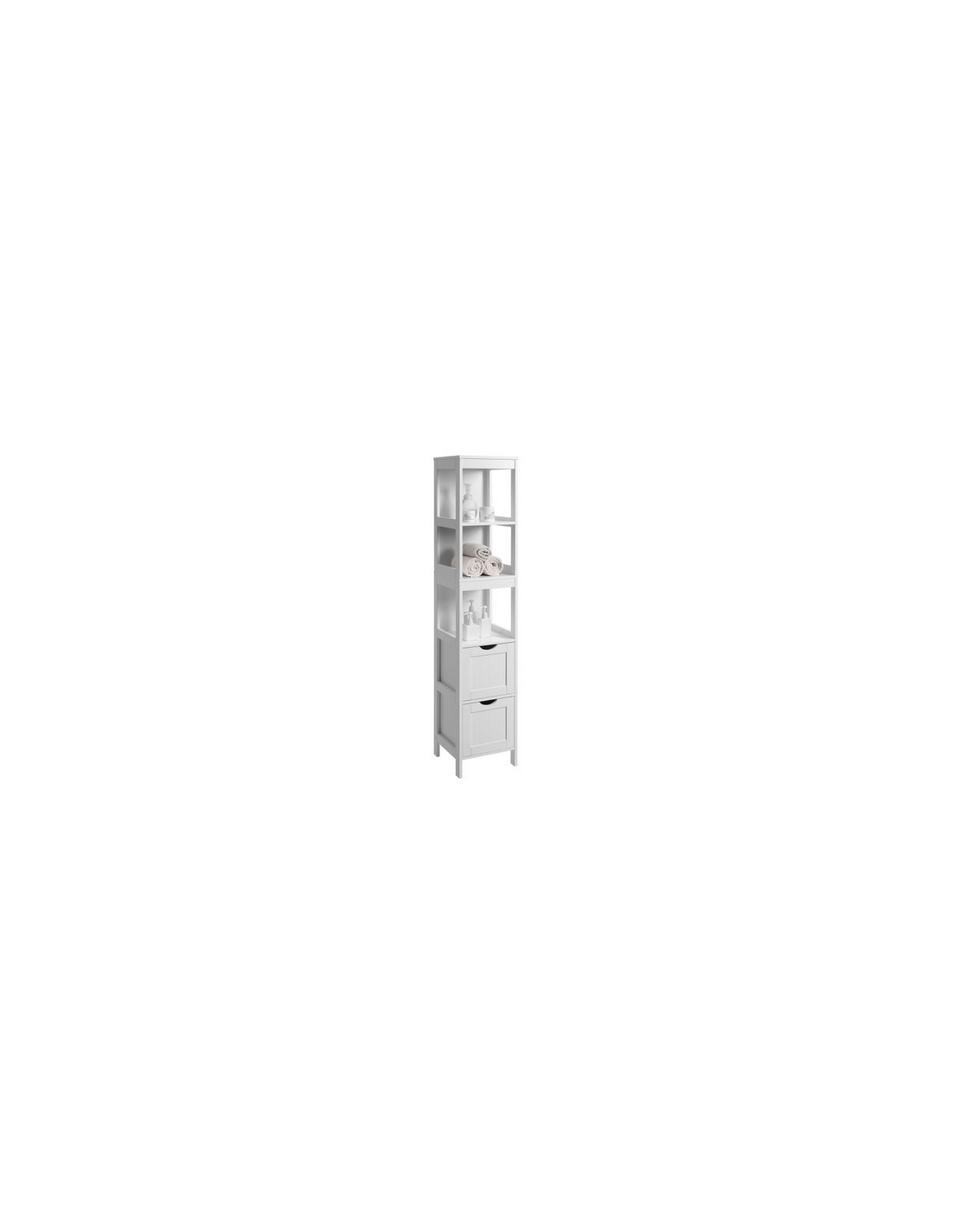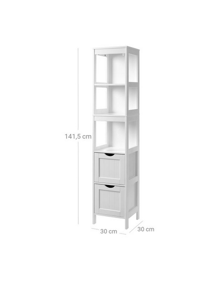 Skab til badeværelset, udført i et design af hvid mdf. Skabet måler 141,5 cm i højden og 30 x 30 cm i bredde og dybde. Skabet indeholder 2 skuffer og 3 åbne hylderum.