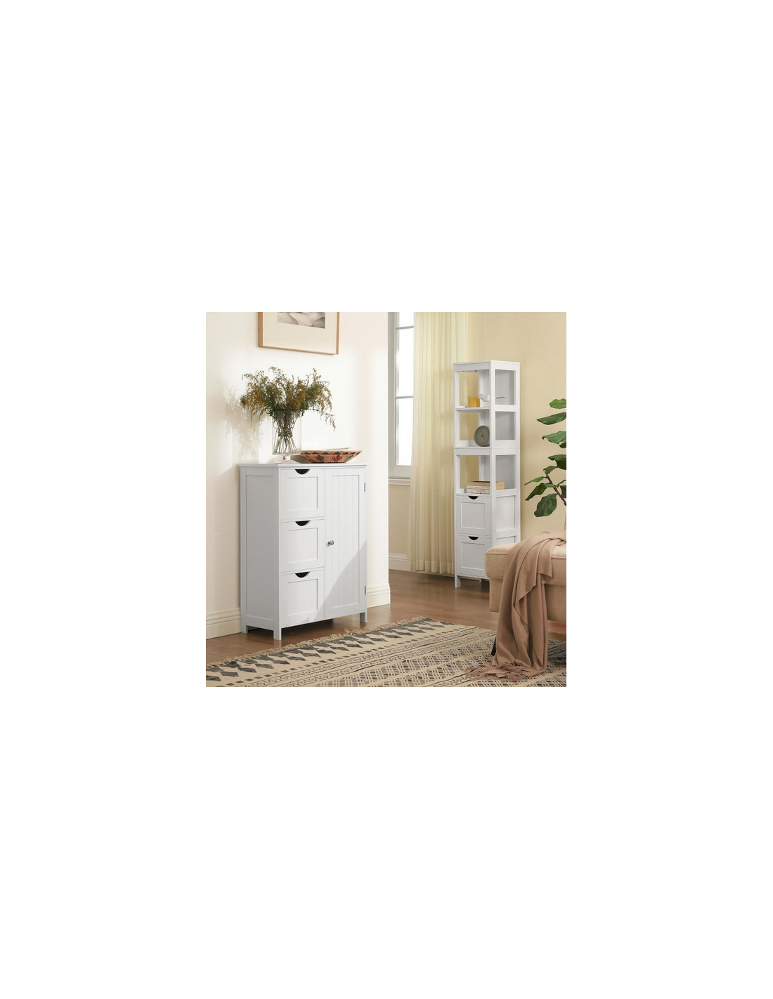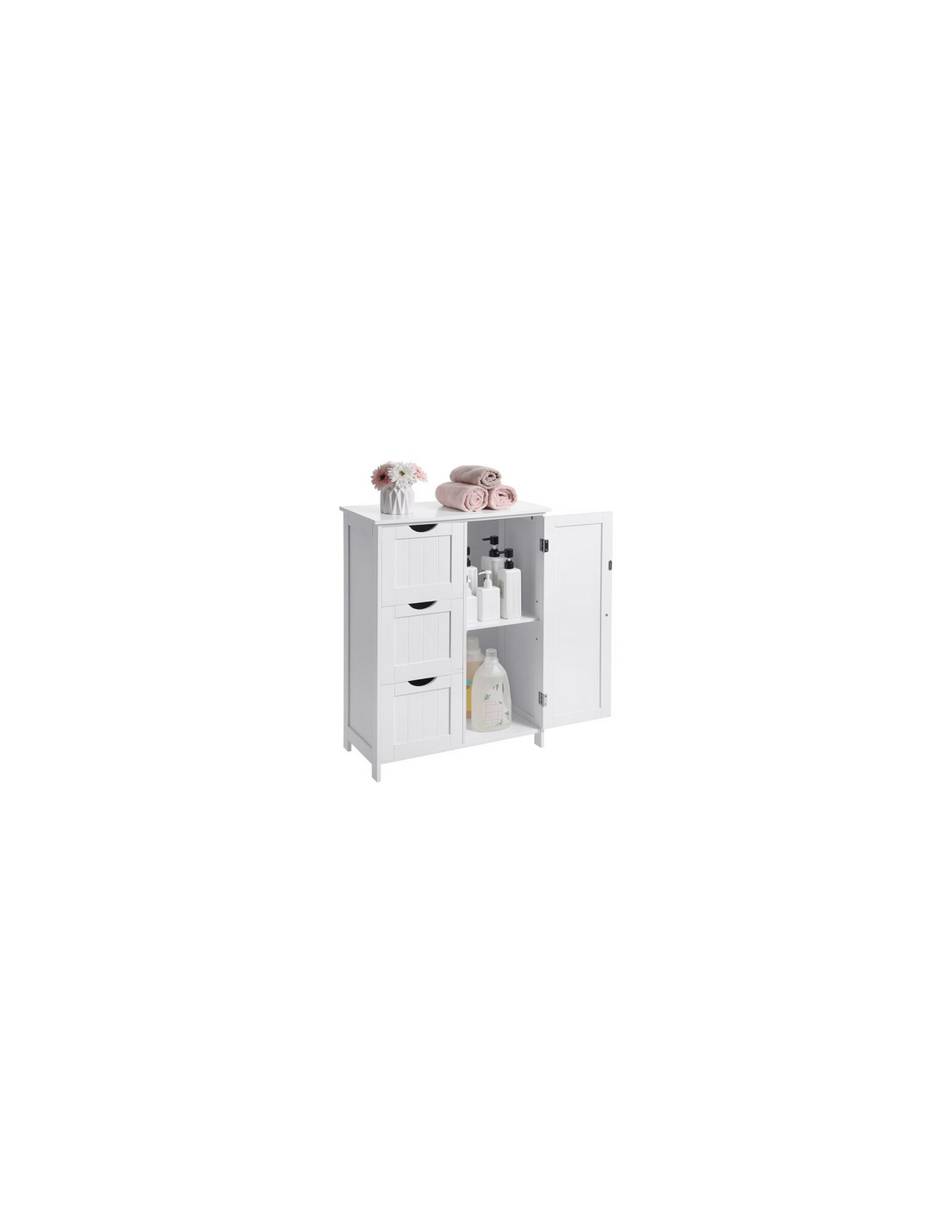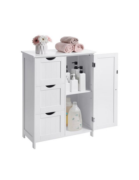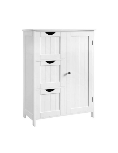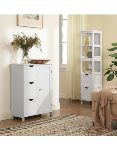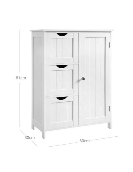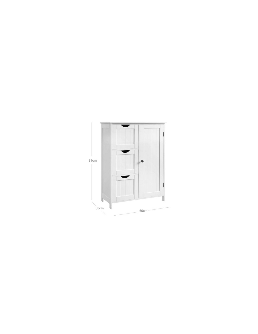 Skab til badeværelset, udført i et design af hvid mdf. Skabet måler 81 cm i højden og 60 x 30 cm i bredde og dybde. Skabet indeholder 3 skuffer og 1 skab med 1 justerbar hylde.