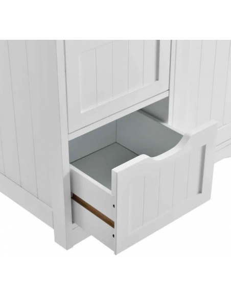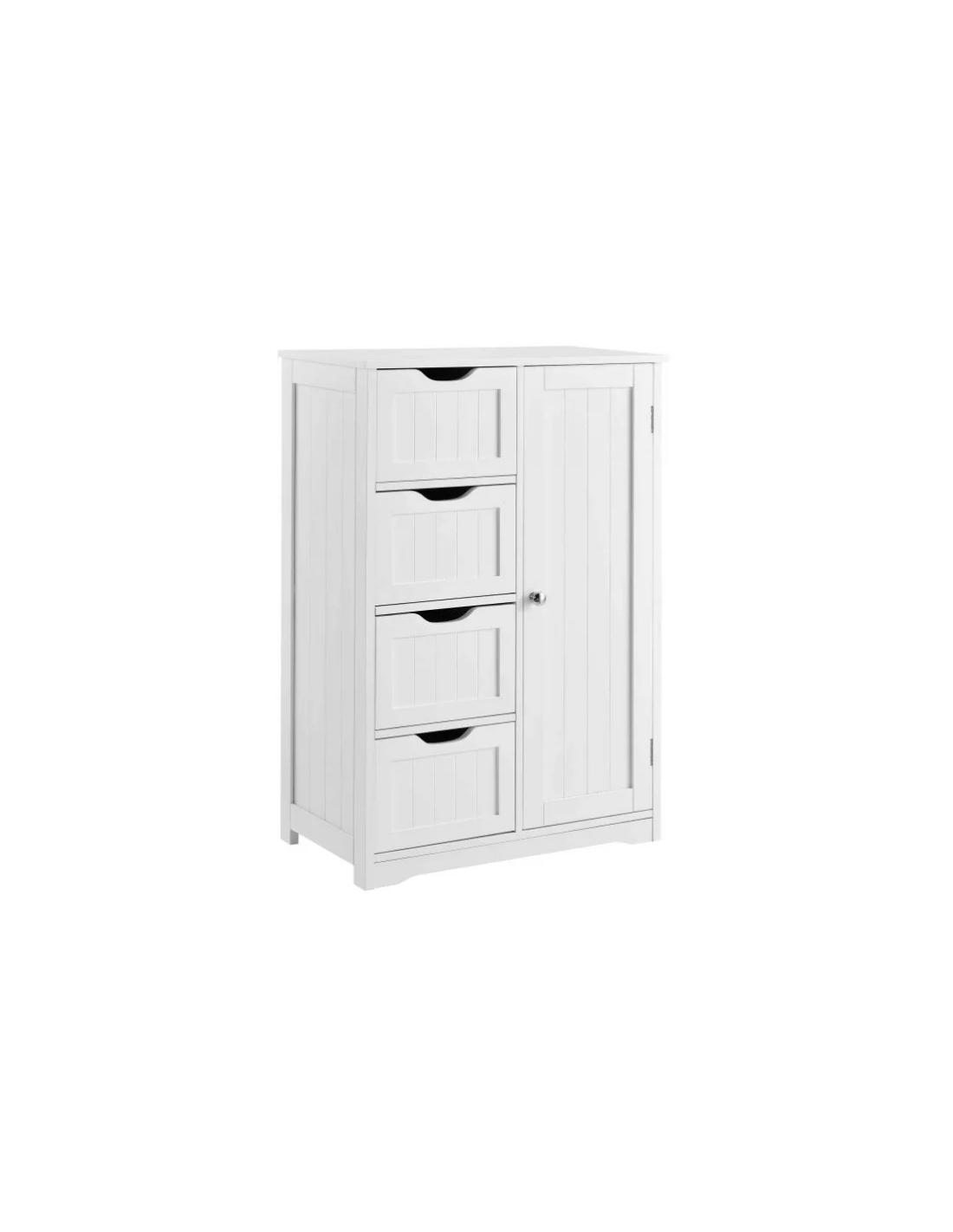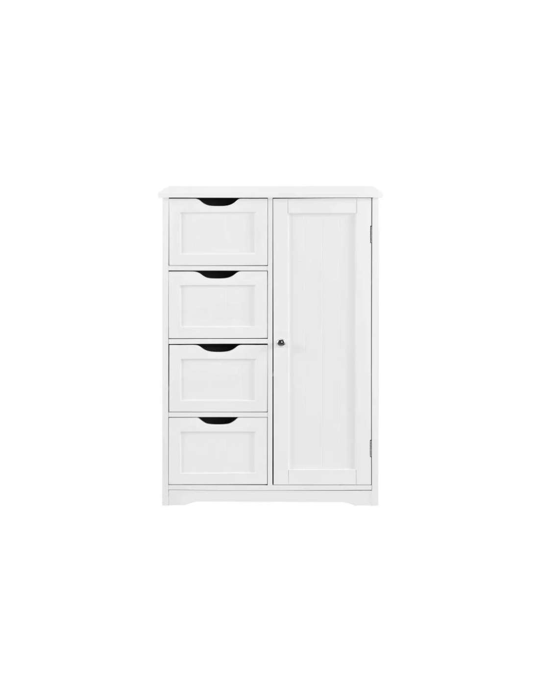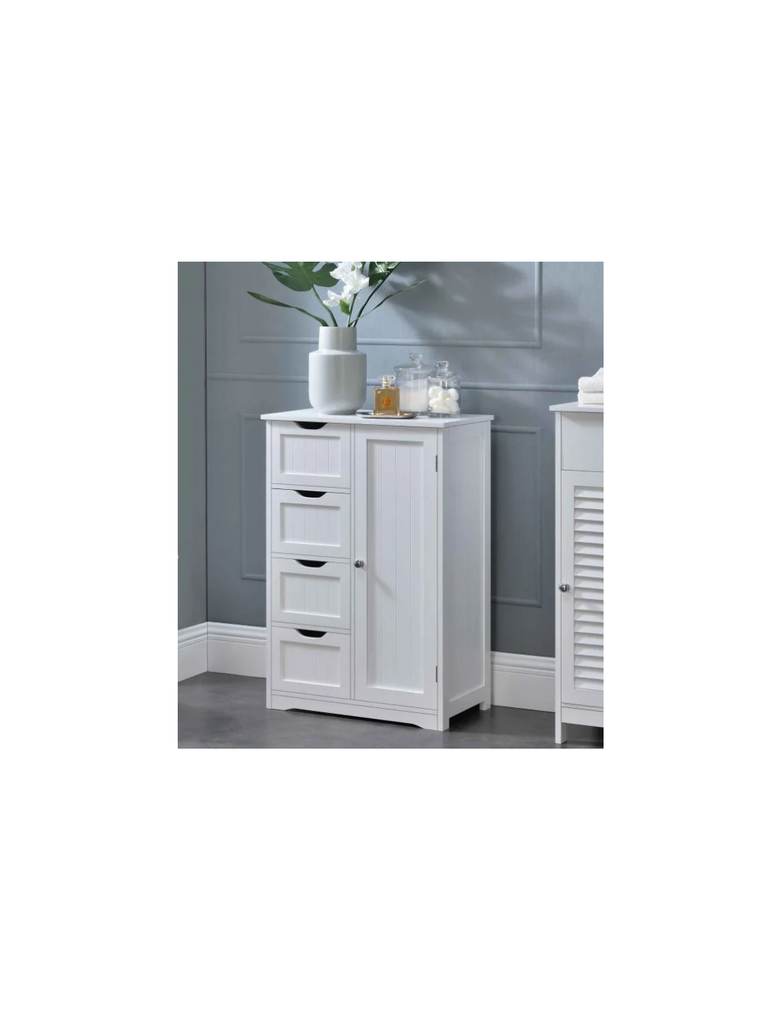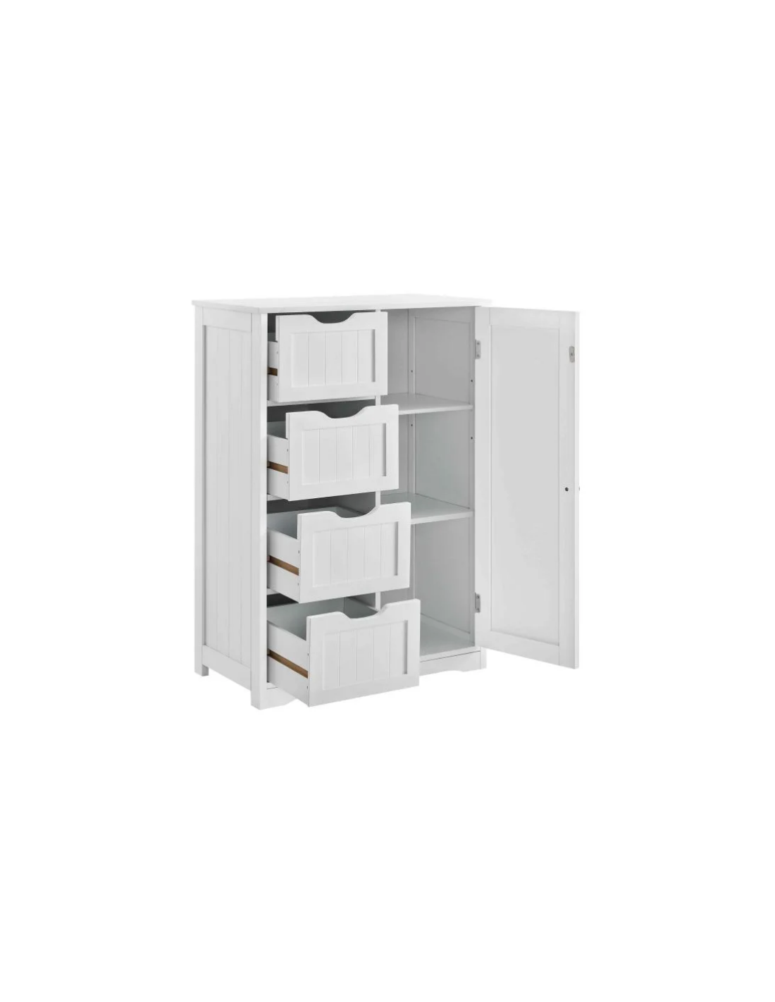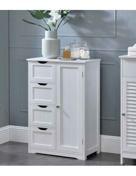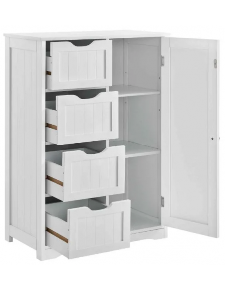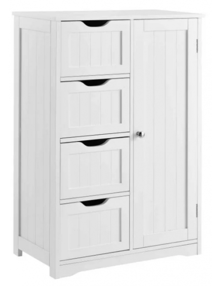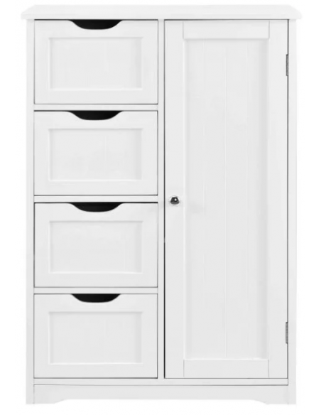 Skab til badeværelset, udført i et design af hvid mdf. Skabet måler 81 cm i højden og 55 x 30 cm i bredde og dybde. Skabet indeholder 4 skuffer og 1 skab med 2 hylder, hvoraf den ene er justerbar.