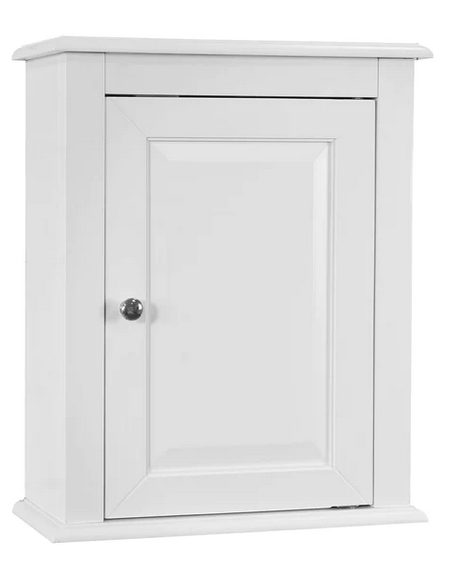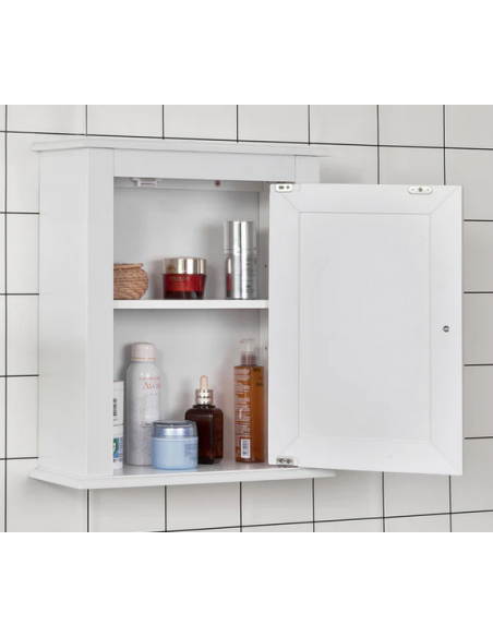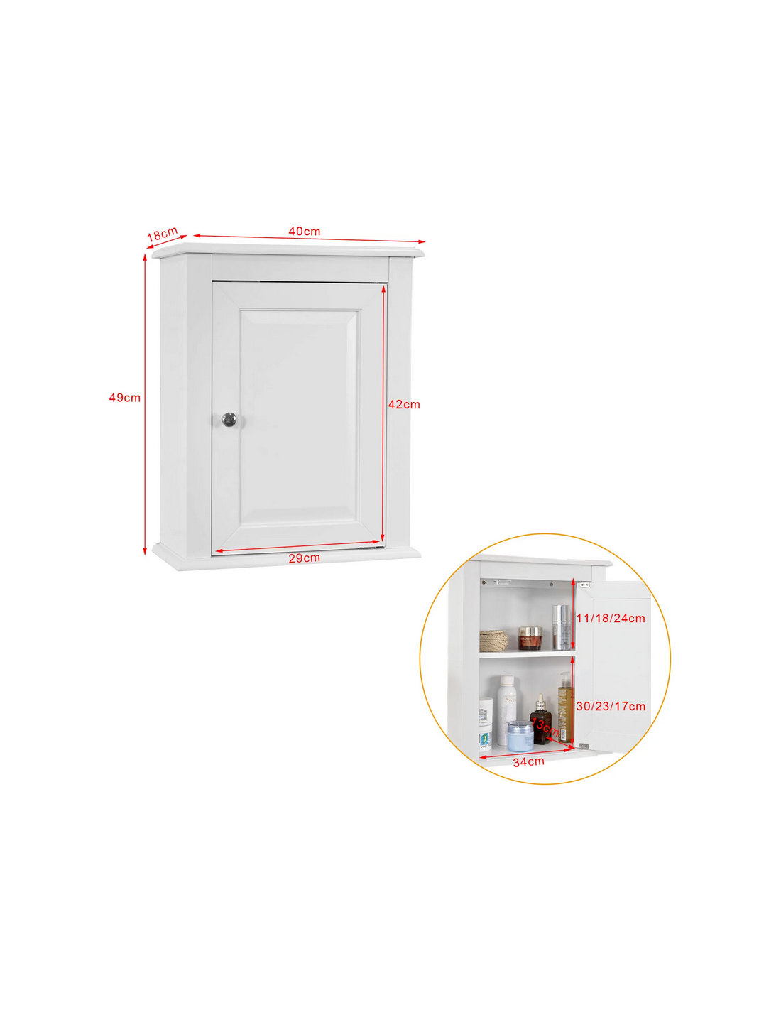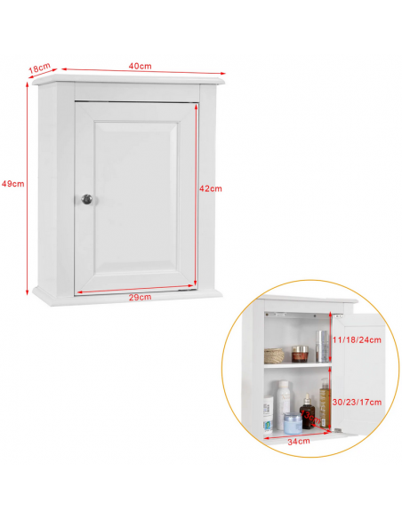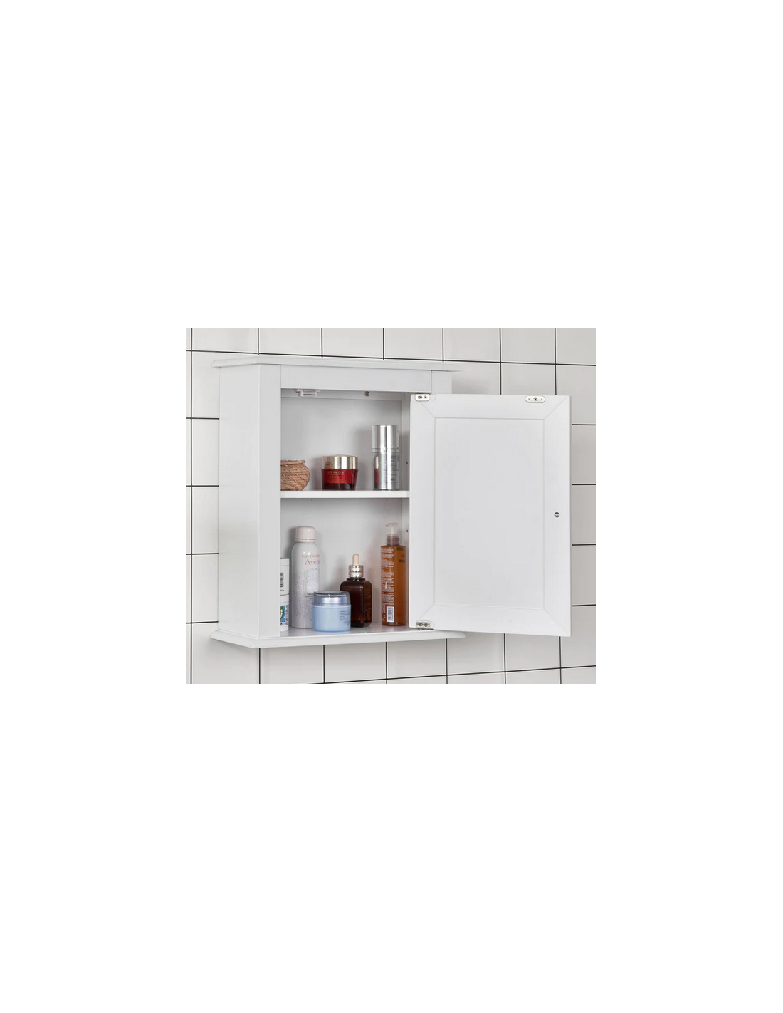 Skab til badeværelset, udført i et design af hvid møbelplade. Skabet måler 49 cm i højden og 40 x 18 cm i bredde og dybde.