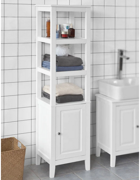 Skab til badeværelset, udført i et design af hvid MDF og møbelplade. Skabet måler 151 cm i højden og 40 x 33 cm i bredde og dybde.