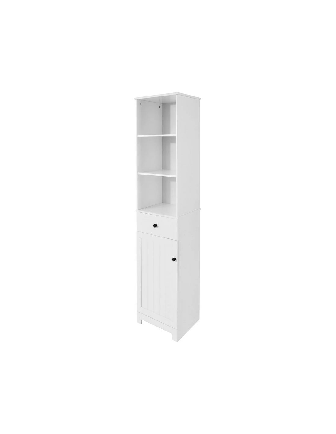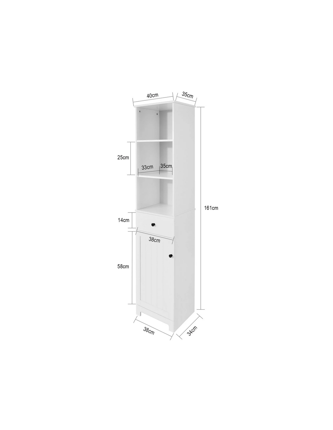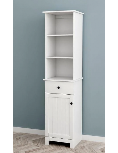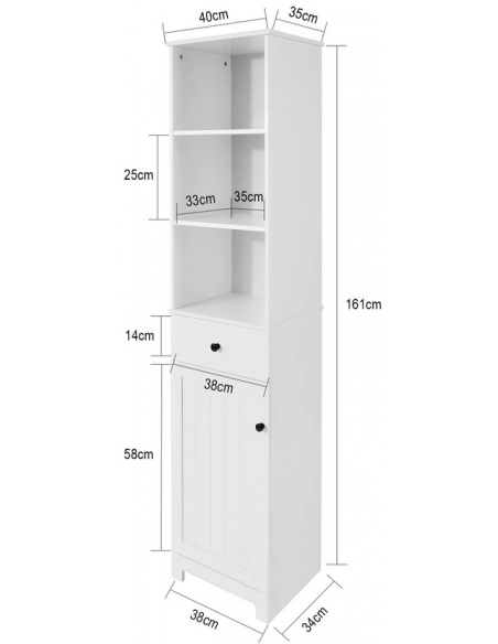 Skab til badeværelset, udført i et design af hvid møbelplade. Skabet måler 161 cm i højden og 40 x 35 cm i bredde og dybde.